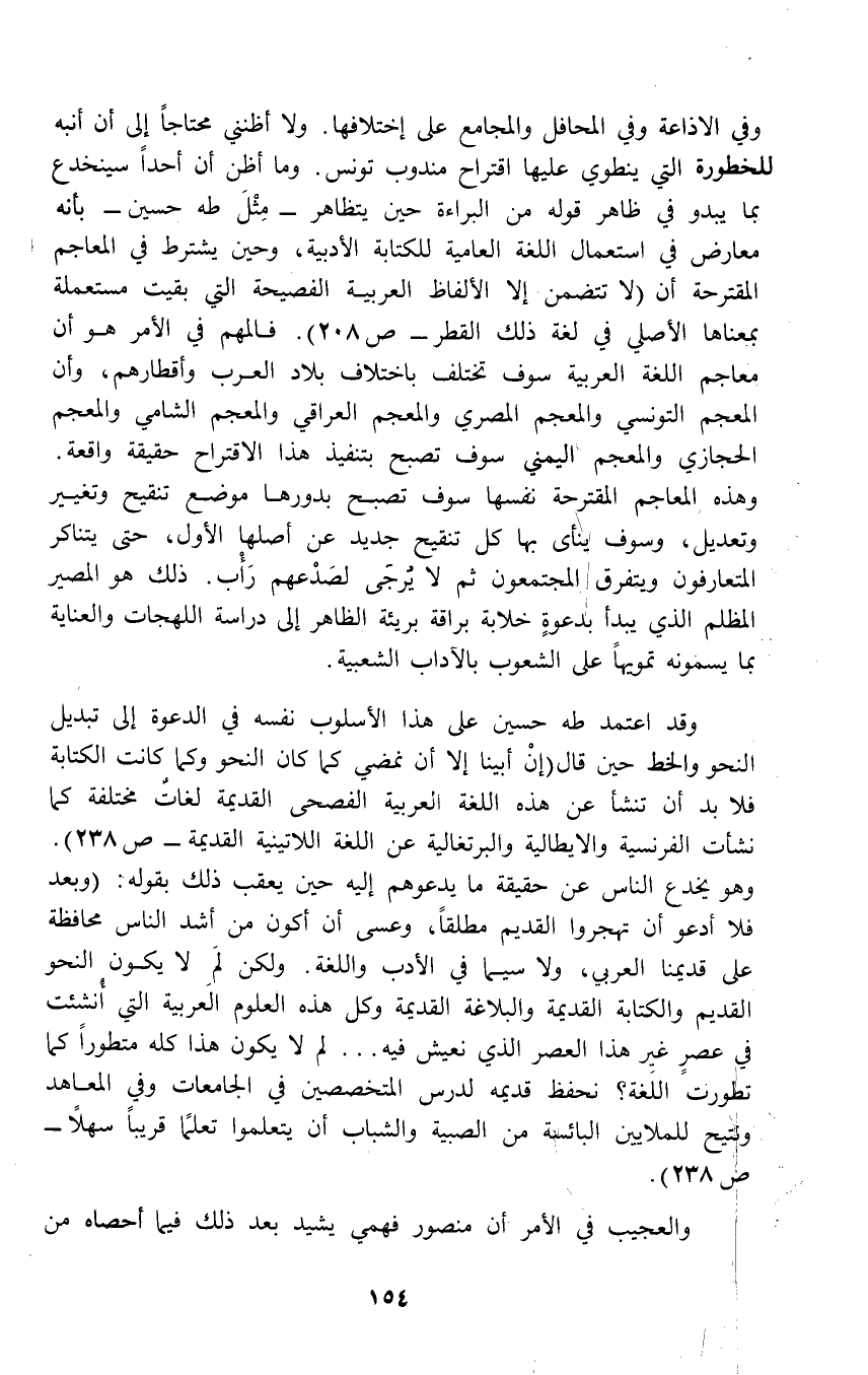 وقد اعتمد طه حسين على هذا الأسلوب نفسه في الدعوة إلى تبديل النحو والخط حين قال (إنْ أبينا إلا أن نمضي كما كان النحو وكما كانت الكتابة فلا بد أن تنشأ عن هذه اللغة العربية الفصحى القديمة لغات مختلفة كما نشأت الفرنسية والايطالية والبرتغالية عن اللغة اللاتينية القديمة - ص 238). وهو يخدع الناس عن حقيقة ما يدعوهم إليه حين يعقب ذلك بقوله: (وبعد فلا أدعو أن تهجروا القديم مطلقاً، وعسى أن أكون من أشد الناس محافظة على قديمنا العربي، ولا سيما في الأدب واللغة. ولكن لمَ لا يكون النحو القديم والكتابة القديمة والبلاغة القديمة وكل هذه العلوم العربية التي أُنشئت في عصرٍ غير هذا العصر الذي نعيش فيه ... لم لا يكون هذا كله متطوراً كما تطورت اللغة؟ نحفظ قديمه لدرس المتخصصين في الجامعات وفي المعاهد وتتيح للملايين البائسة من الصبية والشباب أن يتعلموا تعلمًا قريباً سهلاً - ص 238).