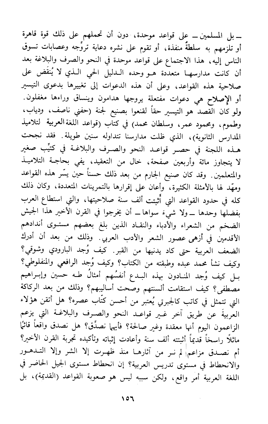 - بل المسلمين - على قواعد موحدة، دون أن تحملهم على ذلك قوة قاهرة أو تلزمهم به سلطةٌ منفذة، أو تقوم على نشره دعاية تروِّجه وعصابات تسوق الناس إليه، هذا الاجتماع على قواعد موحدة في النحو والصرف والبلاغة بعد أن كانت مدارسها متعددة هو وحده الدليل الحي الذي لا يُنقَض على صلاحية هذه القواعد، وعلى أن هذه الدعوات إلى تغييرها بدعوى التيسير أو الِإصلاح هي دعوات مفتعلة يروجها هدامون وينساق وراءها مغفلون. ولو كان القصد هو التيسير حقاً لقنعوا بصنيع لجنة (حفني ناصف، ودياب، وطموم، ومحمود عمر، وسلطان مُحَمَّدْ) في كتاب (قواعد اللغة العربية لتلاميذ المدارس الثانوية)، الذي ظلت مدارسنا تتداوله سنين طويلة. فقد نجحت هذه اللجنة في حصر قواعد النحو والصرف والبلاغة في كتيِّب صغير لا يتجاوز مائة وأربعين صفحة، خال من التعقيد، يفي بحاجة التلاميذ والمتعلمين. وقد كان صنيع الجارم من بعد ذلك حسناً حين يسّر هذه القواعد ومهّد لها بالأمثلة الكثيرة، وأعان على إقرارها بالتمرينات المتعددة، وكان ذلك كله في حدود القواعد التي أثبتت ألف سنة صلاحيتها، والتي استطاع العرب بفضلها وحدها - ولا شيءَ سواها - أن يخرجوا في القرن الأخير هذا الجيش الضخم من الشعراء والأدباء والنقاد الذين بلغ بعضهم مستوى أندادهم الأقدمين في أزهى عصور الشعر والأدب العربي. وذلك من بعد أن أدرك الضعف العربية حتى كاد يدنيها من القبر. كيف وُجد البارودي وشوقي؟ وكيف نشأ مُحَمَّدْ عبده وطبقته من الكتاب؟ وكيف وُجد الرافعي والمنفلوطي؟ بل كيف وُجد المنادون بهذه البدع أنفسُهم أمثالُ طه حسين وإبراهيم مصطفى؟ كيف استقامت ألسنتهم وصحت أساليبهم؟ وذلك من بعد الركاكة التي تتمثل في كاتب كالجبرتي يُعتبر من أحسن كتّاب عصره؟ هل أتقن هؤلاء العربية عن طريق آخر غير قواعد النحو والصرف والبلاغة التي يزعم الزاعمون اليوم أنها معقدة وغير صالحة؟ فأيهما نصدِّق؟ هل نصدق واقعاً قائمًا ماثلًا راسخاً قديماً أثبتته ألف سنة وأعادت إثباته وتأكيده تجربة القرن الأخير؟ أم نصدق مزاعم لم نر من آثارها منذ ظهرت إلا الشر وإلا التدهور والانحطاط في مستوى تدريس العربية؟ إن انحطاط مستوى الجيل الحاضر في اللغة العربية أمر واقع، ولكن سببه ليس هو صعوبة القواعد (القديمة)، بل