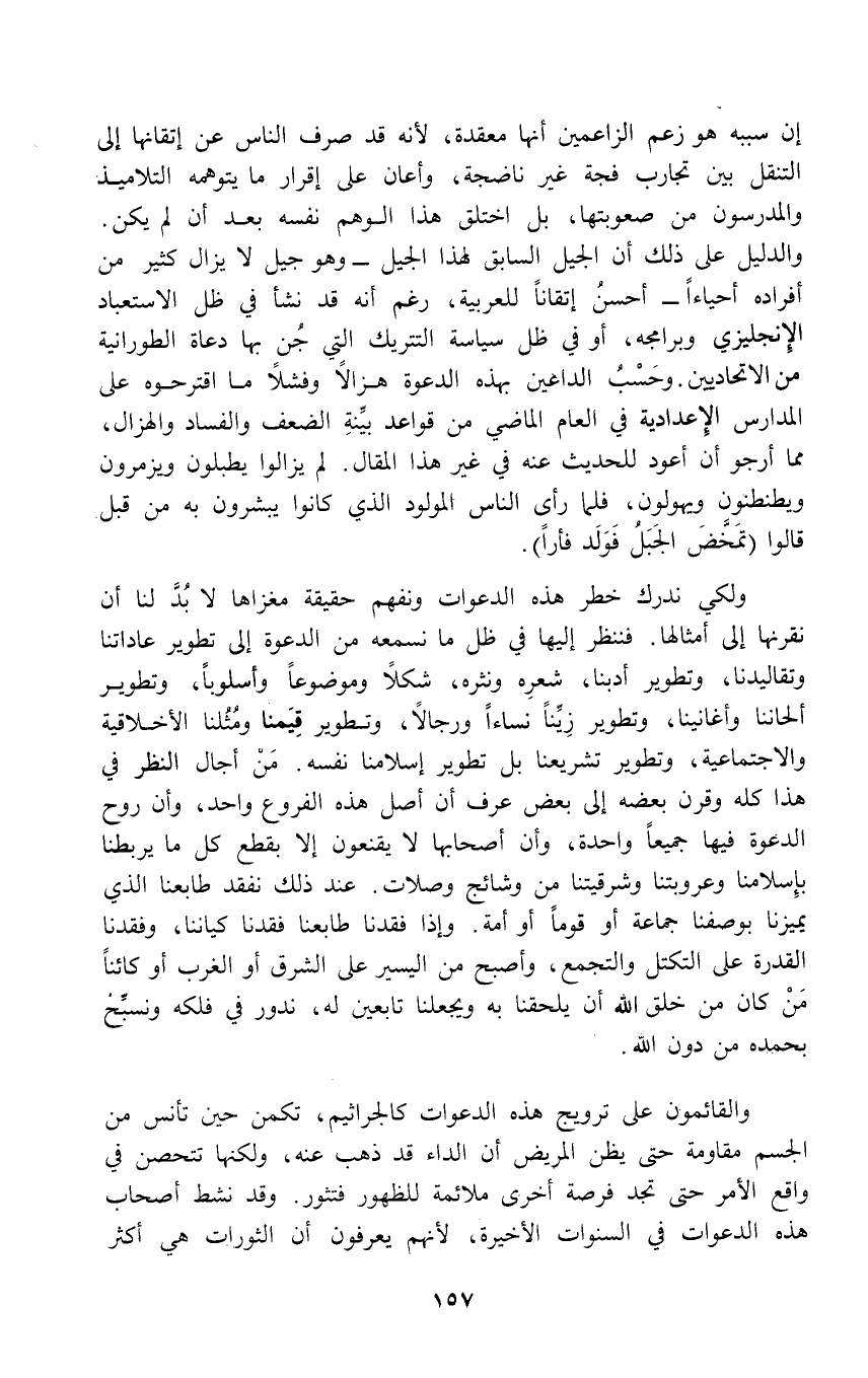ولكي ندرك خطر هذه الدعوات ونفهم حقيقة مغزاها لا بُدَّ لنا أن نقرنها إلى أمثالها. فننظر إليها في ظل ما نسمعه من الدعوة إلى تطوير عاداتنا وتقاليدنا، وتطوير أدبنا، شعرِه ونثره، شكلاً وموضوعاً وأسلوباً، وتطوير ألحاننا وأغانينا، وتطوير زِيِّناً نساءاً ورجالاً، وتطوير قِيَمنا ومُثُلنا الأخلاقية والاجتماعية، وتطوير تشريعنا بل تطوير إسلامنا نفسه. مَن أجال النظر في هذا كله وقرن بعضه إلى بعض عرف أن أصل هذه الفروع واحد، وأن روح الدعوة فيها جميعاً واحدة، وأن أصحابها لا يقنعون إلا بقطع كل ما يربطنا بإِسلامنا وعروبتنا وشرقيتنا من وشائج وصلات. عند ذلك نفقد طابعنا الذي يميزنا بوصفنا جماعة أو قوماً أو أمة. وإذا فقدنا طابعنا فقدنا كياننا، وفقدنا القدرة على التكتل والتجمع، وأصبح من اليسير على الشرق أو الغرب أو كائناً مَنْ كان من خلق الله أن يلحقنا به ويجعلنا تابعين له، ندور في فلكه ونسبِّحُ بحمده من دون الله.