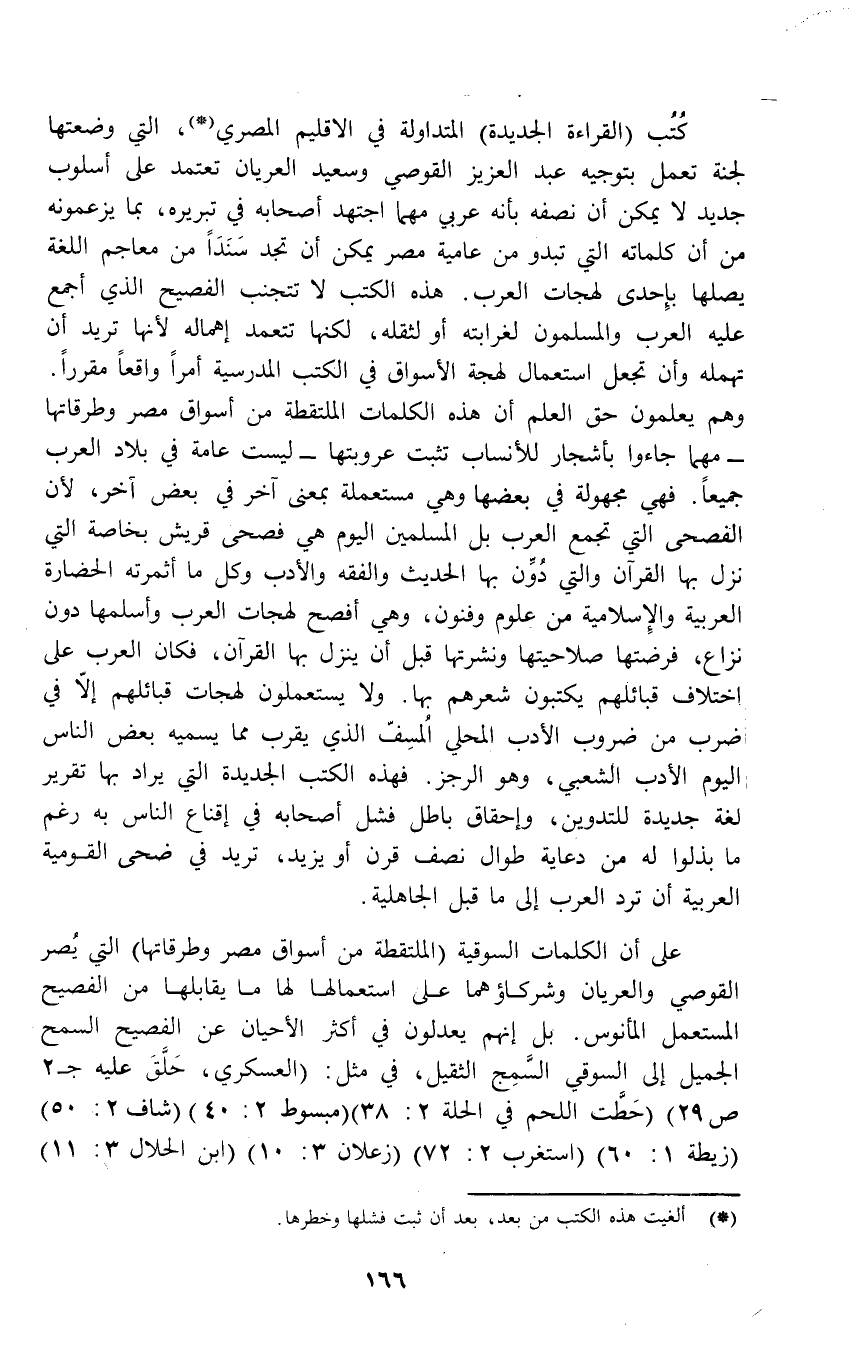 كُتُب (القراءة الجديدة) المتداولة في الاقليم المصري (*)، التي وضعتها لجنة تعمل بتوجيه عبد العزيز القوصي وسعيد العريان تعتمد على أسلوب جديد لا يمكن أن نصفه بأنه عربي مهما اجتهد أصحابه في تبريره، بما يزعمونه من أن كلماته التي تبدو من عامية مصر يمكن أن تجد سَنَدَاً من معاجم اللغة يصلها بإِحدى لهجات العرب. هذه الكتب لا تتجنب الفصيح الذي أجمع عليه العرب والمسلمون لغرابته أو لثقله، لكنها تتعمد إهماله لأنها تريد أن تهمله وأن تجعل استعمال لهجة الأسواق في الكتب المدرسية أمراً واقعاً مقرراً. وهم يعلمون حق العلم أن هذه الكلمات الملتقطة من أسواق مصر وطرقاتها - مهما جاءوا بأشجار للأنساب تثبت عروبتها - ليست عامة في بلاد العرب جميعاً. فهي مجهولة في بعضها وهي مستعملة بمعنى آخر في بعض آخر, لأن الفصحى التي تجمع العرب بل المسلمين اليوم هي فصحى قريش بخاصة التي نزل بها القرآن والتي دُوِّن بها الحديث والفقه والأدب وكل ما أثمرته الحضارة العربية والِإسلامية من علوم وفنون، وهي أفصح لهجات العرب وأسلمها دون نزاع، فرضتها صلاحيتها ونشرتها قبل أن ينزل بها القرآن، فكان العرب على اختلاف قبائلهم يكتبون شعرهم بها. ولا يستعملون لهجات قبائلهم إلَّا في ضرب من ضروب الأدب المحلي المُسِفّ الذي يقرب مما يسميه بعض الناس اليوم الأدب الشعبي، وهو الرجز. فهذه الكتب الجديدة التي يراد بها تقرير لغة جديدة للتدوين، وإحقاق باطل فشل أصحابه في إقناع الناس به رغم ما بذلوا له من دعاية طوال نصف قرن أو يزيد، تريد في ضحى القومية العربية أن ترد العرب إلى ما قبل الجاهلية.