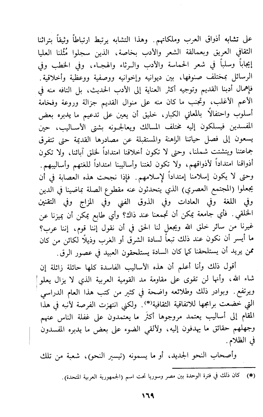 على تشابه أذواق العرب وملكاتهم. وهذا التشابه يرتبط ارتباطاً وثيقاً بتراثنا الثقافي العريق وبعمالقة الشعر والأدب بخاصة، الذين سجلوا مُثُلنا العليا إيجاباً وسلباً في شعر الحماسة والأدب والرثاء والهجاء، وفي الخطب وفي الرسائل بمختلف صنوفها، بين ديوانيه وإخوانيه ووصفية ووعظية وأخلاقية. فإِهمال أدبنا القديم وتوجيه أكثر العناية إلى الأدب الحديث، بل التافه منه في الأعم الأغلب، وتجنب ما كان منه على منوال القديم جزالة وروعة وفخامة أسلوب واحتفالاً بالمعاني الكبار، خليق أن يعين على تدعيم ما يدبره بعض المفسدين فيسلكون إليه مختلف المسالك ويعالجونه بشتى الأساليب، حين يسعون إلى فصل حياتنا الراهنة والمستقبلة عن مصادرها القديمة حتى تتفرق جماعتنا ويتشتت شملنا، وحتى لا تكون أخلاقنا امتداداً لخلق آبائنا, ولا تكون أذواقنا امتداداً لأذواقهم، ولا تكون لغتنا وأساليبنا امتداداً للغتهم وأساليبهم. وحتى لا يكون إسلامنا إمتداداً لإِسلامهم. فإِذا نجحت هذه العصابة في أن يجعلوا (المجتمع العصري) الذي يتحدثون عنه مقطوع الصلة بماضينا في الدين وفي اللغة وفي العادات وفي الذوق الفني وفي المزاج وفي التقنين الخلقي. فأي جامعة يمكن أن تجمعنا عند ذاك؟ وأي طابع يمكن أن يميزنا عن غيرنا من سائر خلق الله ويجعل لنا الحق في أن نقول إننا قوم، إننا عرب؟ ما أيسر أن نكون عند ذلك تبعاً لسادة الشرق أو الغرب وذيلاً لكائن من كان ممن يريد أن يستلحقنا كما كان السادة يستلحقون العبيد في عصور الرق.