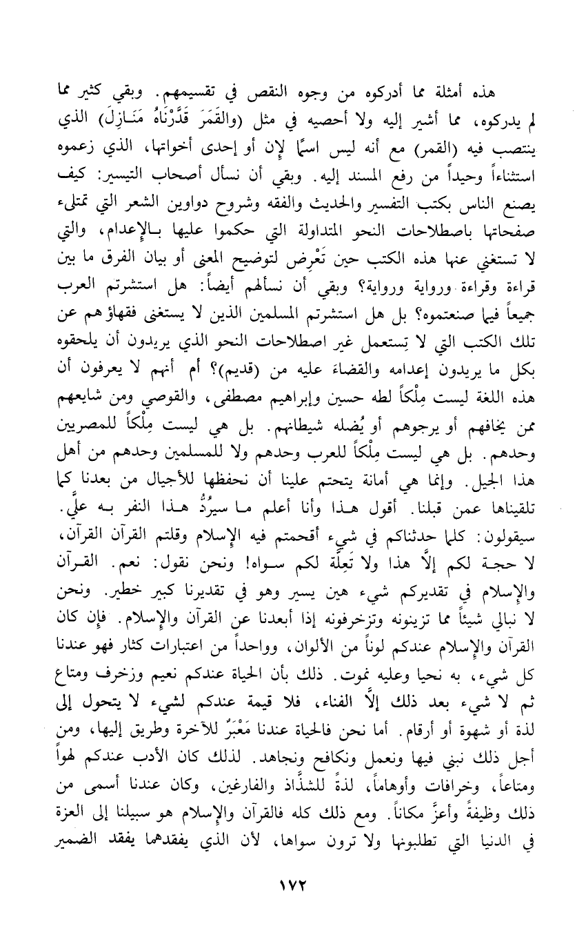 هذه أمثلة مما أدركوه من وجوه النقص في تقسيمهمِ. وبقي كثير مما لم يدركوه، مما أشير إليه ولا أحصيه في مثل (والقَمَرَ قَدَّرْناهُ مَنَازِلَ) الذي ينتصب فيه (القمر) مع أنه ليس اسمًا لإِن أو إحدى أخواتها، الذي زعموه استثناءاً وحيداً من رفع المسند إليه. وبقي أن نسأل أصحاب التيسير: كيف يصنع الناس بكتب التفسير والحديث والفقه وشروح دواوين الشعر التي تمتلىء صفحاتها باصطلاحات النحو المتداولة التي حكموا عليها بالإِعدام، والتي لا تستغني عنها هذه الكتب حين تَعْرِض لتوضيح المعنى أو بيان الفرق ما بين قراءة وقراءة - ورواية ورواية؟ وبقي أن نسألهم أيضاً: هل استشرتم العرب جميعاً فيما صنعتموه؟ بل هل استشرتم المسلمين الذين لا يستغنى فقهاؤهم عن تلك الكتب التي لا تِستعمل غير اصطلاحات النحو الذي يريدون أن يلحقوه بكل ما يريدون إعدامه والقضاءَ عليه من (قديم)؟ أم أنهم لا يعرفون أن هذه اللغة ليست مِلْكاً لطه حسين وإبراهيم مصطفى، والقوصي ومن شايعهم ممن يخافهم أو يرجوهم أو يُضله شيطانهم. بل هي ليست مِلْكاً للمصريين وحدهم. بل هي ليست مِلْكاً للعرب وحدهم ولا للمسلمين وحدهم من أهل هذا الجيل. وإنما هي أمانة يتحتم علينا أن نحفظها للأجيال من بعدنا كما تلقيناها عمن قبلنا. أقول هذا وأنا أعلم ما سيرُدُّ هذا النفر به عليَّ. سيقولون: كلما حدثناكم في شىِء أقحمتم فيه الإِسلام وقلتم القرآن القرآن، لا حجة لكم إلَّا هذا ولا تعِلّة لكم سواه! ونحن نقول: نعم. القرآن والإِسلام في تقديركم شيء هين يسير وهو في تقديرنا كبير خطير. ونحن لا نبالي شيئاً مما تزينونه وتزخرفونه إذا أبعدنا عن القرآن والإِسلام. فإِن كان القرآن والإِسلام عندكم لوناً من الألوان، وواحداً من اعتبارات كثار فهو عندنا كل شيء، به نحيا وعليه نموت. ذلك بأن الحياة عندكم نعيم وزخرف ومتاع ثم لا شيء بعد ذلك إلًا الفناء، فلا قيمة عندكم لشيء لايتحول إلى لذة أو شهوة أو أرقام. أما نحن فالحياة عندنا مَعْبَرٌ للآخرة وطريق إليها، ومن أجل ذلك نبني فيها ونعمل ونكافح ونجاهد. لذلك كان الأدب عندكم لهواً ومتاعاً، وخرافات وأوهاماً، لذةً للشذَّاذ والفارغين، وكان عندنا أسمى من ذلك وظيفةً وأعزَّ مكاناً. ومع ذلك كله فالقرآن والإِسلام هو سبيلنا إلى العزة في الدنيا التي تطلبونها ولا ترون سواها, لأن الذي يفقدهما يفقد الضمير