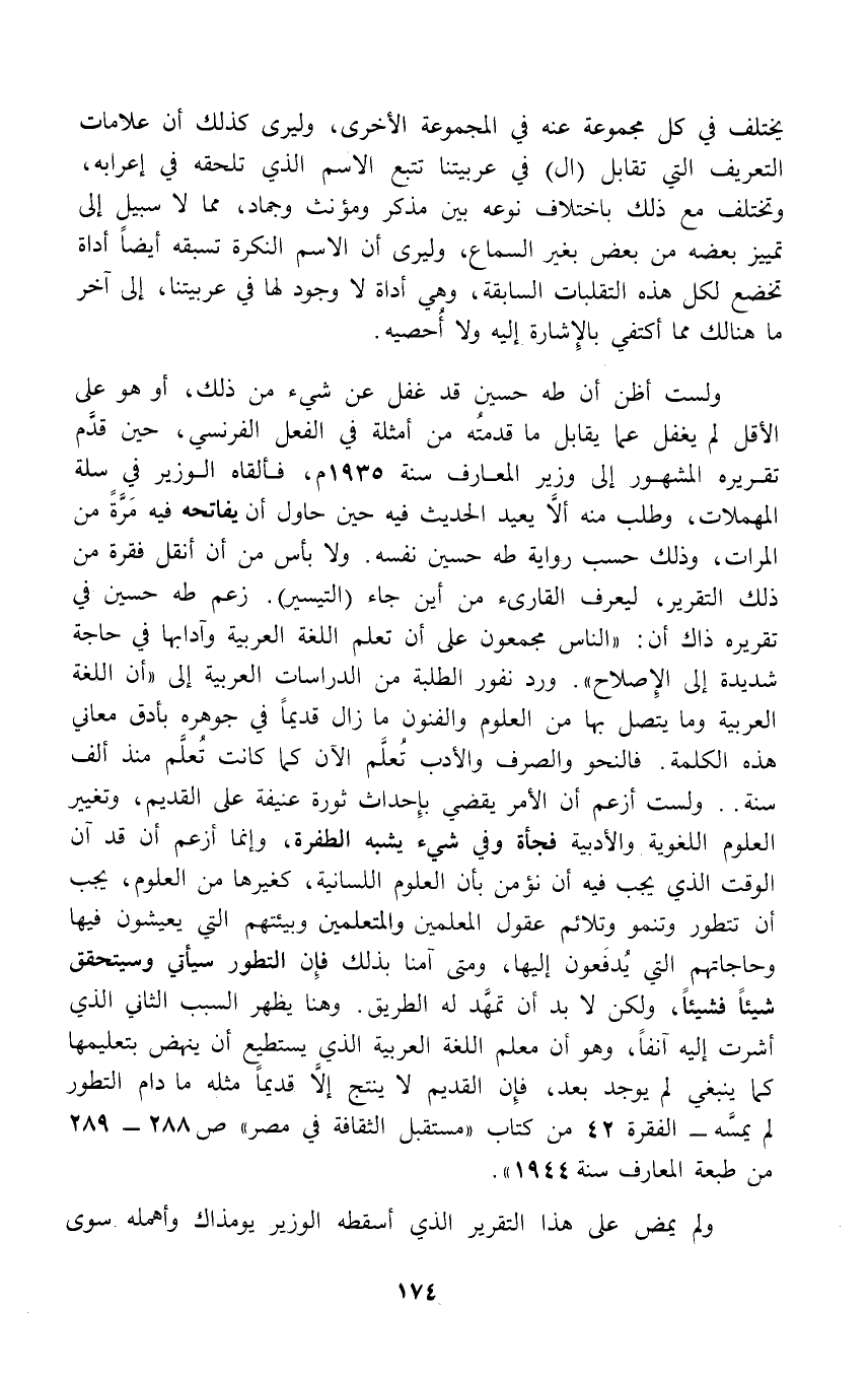 ولست أظن أن طه حسين قد غفل عن شيء من ذلك، أو هو على الأقل لم يغفل عما يقابل ما قدمتُه من أمثلة في الفعل الفرنسي، حين قدَّم تقريره المشهور إلى وزير المعارف سنة 1935 م، فألقاه الوزير في سلة المهملات، وطلب منه ألَّا يعيد الحديث فيه حين حاول أن يفاتحه فيه مَرَّةً من المرات، وذلك حسب رواية طه حسين نفسه. ولا بأس من أن أنقل فقرة من ذلك التقرير، ليعرف القارئ من أين جاء (التيسير). زعم طه حسين في تقريره ذاك أن: "الناس مجمعون على أن تعلم اللغة العربية وآدابها في حاجة شديدة إلى الإِصلاح". ورد نفور الطلبة من الدراسات العربية إلى "أن اللغة العربية وما يتصل بها من العلوم والفنون ما زال قديماً في جوهره بأدق معاني هذه الكلمة. فالنحو والصرف والأدب تُعلَّم الآن كما كانت تُعلَّم منذ ألف سنة .. ولست أزعم أن الأمر يقضي بإِحداث ثورة عنيفة على القديم، وتغيير العلوم اللغوية والأدبية فجأة وفي شيء يشبه الطفرة، وإنما أزعم أن قد آن الوقت الذي يجب فيه أن نؤمن بأن العلوم اللسانية، كغيرها من العلوم، يجب أن تتطور وتنمو وتلائم عقول المعلمين والمتعلمين وبيئتهم التي يعيشون فيها وحاجاتهم التي يُدفَعون إليها، ومتى آمنا بذلك فإِن التطور سيأتي وسيتحقق شيئاً فشيئاً، ولكن لا بد أن تمهَّد له الطريق. وهنا يظهر السبب الثاني الذي أشرت إليه آنفاً، وهو أن معلم اللغة العربية الذي يستطيِع أن ينهض بتعليمها كما ينبغي لم يوجد بعد، فإِن القديم لا ينتج إلَّا قديماً مثله ما دام التطور لم يمسَّه- الفقرة 42 من كتاب "مستقبل الثقافة في مصر" ص 288 - 289 من طبعة العارف سنة 1944".