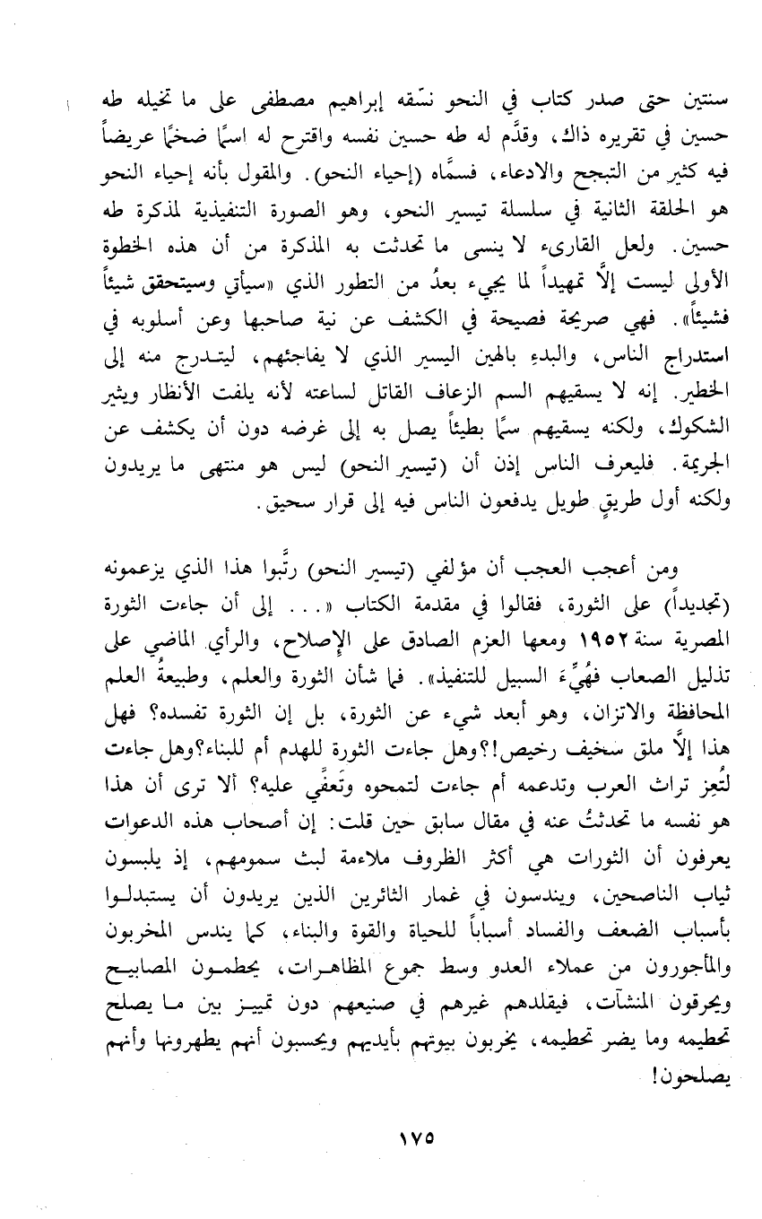 ومن أعجب العجب أن مؤلفي (تيسير النحو) رتَّبوا هذا الذي يزعمونه (تجديداً) على الثورة، فقالوا في مقدمة الكتاب " ... إلى أن جاءت الثورة المصرية سنة 1952 ومعها العزم الصادق على الِإصلاح، والرأي الماضي على تذليل الصعاب فهُيِّءَ السبيل للتنفيذ". فلما شأن الثورة والعلم، وطبيعةُ العلم المحافظة والاتزان، وهو أبعد شيء عن الثورة، بل إن الثورة تفسده؟ فهل هذا إلَّا ملق سخيف رخيص!؟ وهل جاءت الثورة للهدم أم للبناء؟ وهل جاءت لتُعِز تراث العرب وتدعمه أم جاءت لتمحوه وتَعفي عليه؟ ألا ترى أن هذا هو نفسه ما تحدثتُ عنه في مقال سابق حين قلت: إن أصحاب هذه الدعوات يعرفون أن الثورات هي أكثر الظروف ملاءمة لبث سمومهم، إذ يلبسون ثياب الناصحين، ويندسون في غمار الثائرين الذين يريدون أن يستبدلوا بأسباب الضعف والفساد أسباباً للحياة والقوة والبناء، كما يندس المخربون والمأجورون من عملاء العدو وسط جموع المظاهرات، يحطمون المصابيح ويحرقون المنشآت، فيقلدهم غيرهم في صنيعهم دون تمييز بين ما يصلح تحطيمه وما يضر تحطيمه، يخربون بيوتهم بأيديهم ويحسبون أنهم يطهرونها وأنهم يصلحون!