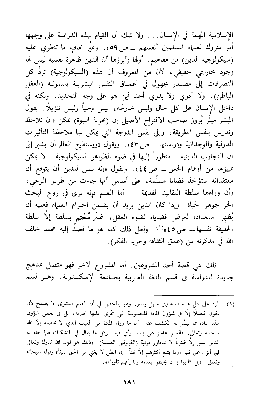 الإِسلامية المهمة في الإِنسان ... ولا شك أن القيام بهذه الدراسة على وجهها أمر متروك لعلماء المسلمين أنفسهم - ص 59". وغيرُ خافٍ ما تنطوي عليه (سيكولوجية الدين) من مفاهيم. أولها وأبرزها أن الدين ظاهرة نفسية ليس لها وجود خارجي حقيقي, لأن من المعروف أن هذه (السيكولوجية) تردُّ كل التصرفات إلى مصدر مجهول في أعماق النفس البشرية يسمونه (العقل الباطن). ولا أدري ولا يدري أحد أين هو على وجه التحديد، ولكنه في داخل الإِنسان على كل حال وليس خارجَه، ليس وحياً وليس تنزيلاً. يقول المبشر ميلَر بْروز صاحب الاقتراح الأصيل إن (تجربة النبوة) يمكن "أن تلاحظ وتدرس بنفس الطريقة، وإلى نفس الدرجة التي يمكن بها ملاحظة التأثيرات الذوقية والوجدانية ودراستها - ص 43". ويقول "ويستطيع العالم أن يشير إلى أن التجارب الدينية - منظوراً إليها في ضوء الظواهر السيكولوجية - لا يمكن تمييزها من أوهام الحس - ص 44". ويقول "إنه ليس للدين أن يتوقع أن معتقداته ستؤخذ قضايا مسلَّمة، على أساس أنها جاءت من طريق الوحي، وأن وراءها سلطة التقاليد القديمة ... أما العلم فإِنه يرى في روح البحث الحر جوهر الحياة. وإذا كان الدين يريد أن يضمن احترام العلماء فعليه أن يُظهِر استعداده لعرض قضاياه لضوء العقل، غيرمُحْتمٍ بسلطة إلَّا سلطة الحقيقة نفسها - ص 45" (¬1). ولعل ذلك كله هو ما قصد إليه مُحَمَّدْ خلف الله في مذكرته من (عمق الثقافة وحرية الفكر).