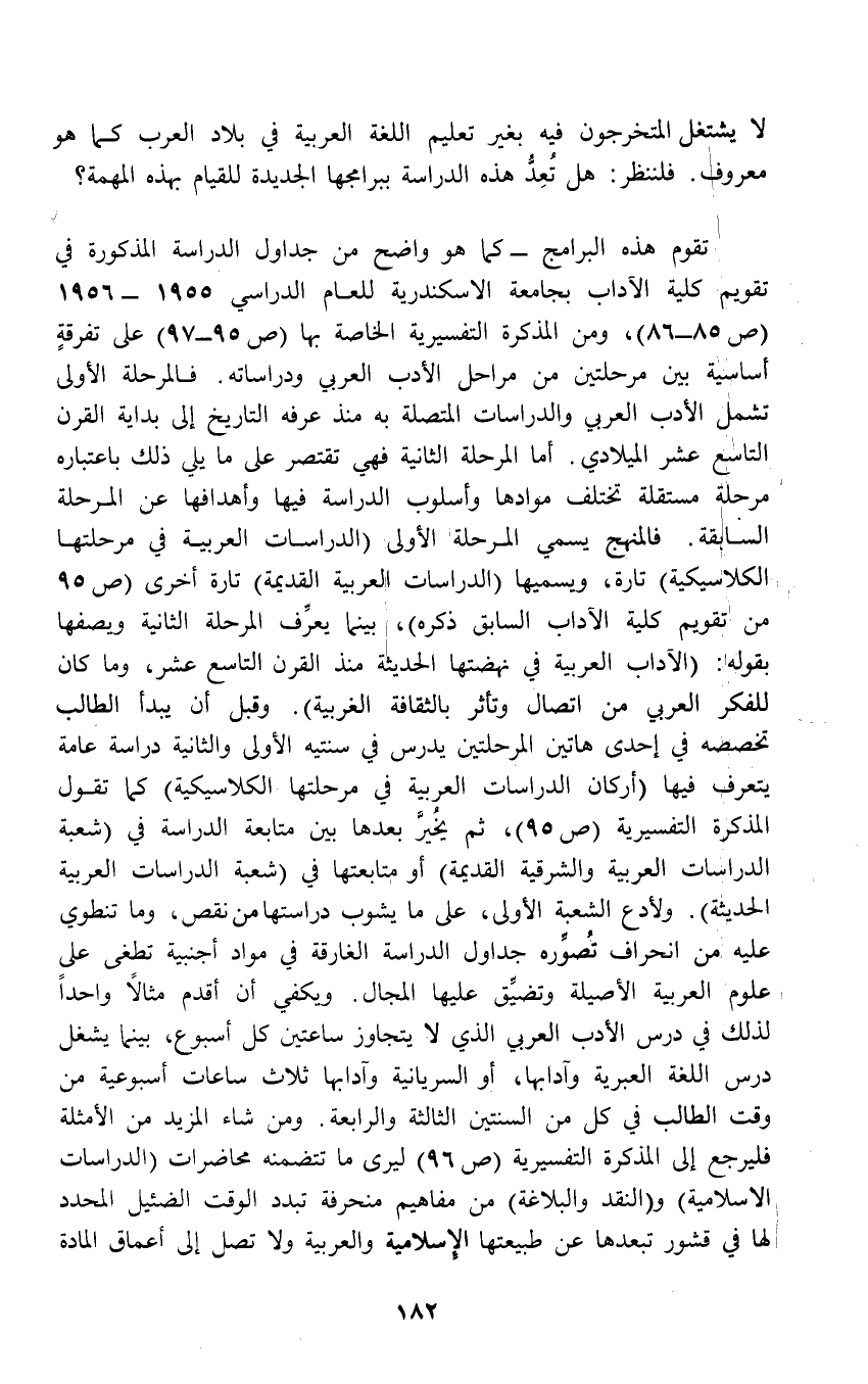 تقوم هذه البرامج - كما هو واضح من جداول الدراسة المذكورة في تقويم كلية الآداب بجامعة الاسكندرية للعام الدراسي 1955 - 1956 (ص 85 - 86)، ومن المذكرة التفسيرية الخاصة بها (ص 95 - 97) على تفرقةٍ أساسية بين مرحلتين من مراحل الأدب العربي ودراساته. فالمرحلة الأولى تشمل الأدب العربي والدراسات المتصلة به منذ عرفه التاريخ إلى بداية القرن التاسع عشر الميلادي. أما المرحلة الثانية فهي تقتصر على ما يلي ذلك باعتباره مرحلة مستقلة تختلف موادها وأسلوب الدراسة فيها وأهدافها عن المرحلة السابقة. فالمنهج يسمي المرحلة الأولى (الدراسات العربية في مرحلتها الكلاسيكية) تارة، ويسميها (الدراسات العربية القديمة) تارة أخرى (ص 95 من تقويم كلية الآداب السابق ذكره)، بينما يعرِّف المرحلة الثانية ويصفها بقوله: (الآداب العربية في نهضتها الحديثة منذ القرن التاسع عشر، وما كان للفكر العربي من اتصال وتأثر بالثقافة الغربية). وقبل أن يبدأ الطالب تخصصه في إحدى هاتين المرحلتين يدرس في سنتيه الأولى والثانية دراسة عامة يتعرف فيها (أركان الدراسات العربية في مرحلتها الكلاسيكية) كما تقول المذكرة التفسيرية (ص 95)، ثم يخُيرَّ بعدها بين متابعة الدراسة في (شعبة الدراسات العربية والشرقية القديمة) أو متابعتها في (شعبة الدراسات العربية الحديثة). ولأدع الشعبة الأولى، على ما يشوب دراستها من نقص، وما تنطوي عليه من انحراف تُصوِّره جداول الدراسة الغارقة في مواد أجنبية تطغى على علوم العربية الأصيلة وتضيِّق عليها المجال. ويكفي أن أقدم مثالاً واحداً لذلك في درس الأدب العربي الذي لا يتجاوز ساعتين كل أسبوع، بينما يشغل درس اللغة العبرية وآدابها، أو السريانية وآدابها ثلاث ساعات أسبوعية من وقت الطالب في كل من السنتين الثالثة والرابعة. ومن شاء المزيد من الأمثلة فليرجع إلى المذكرة التفسيرية (ص 96) ليرى ما تتضمنه محاضرات "الدراسات الإِسلامية) و (النقد والبلاغة) من مفاهيم منحرفة تبدد الوقت الضئيل المحدد لها في قشور تبعدها عن طبيعتها الإِسلامية والعربية ولا تصل إلى أعماق المادة