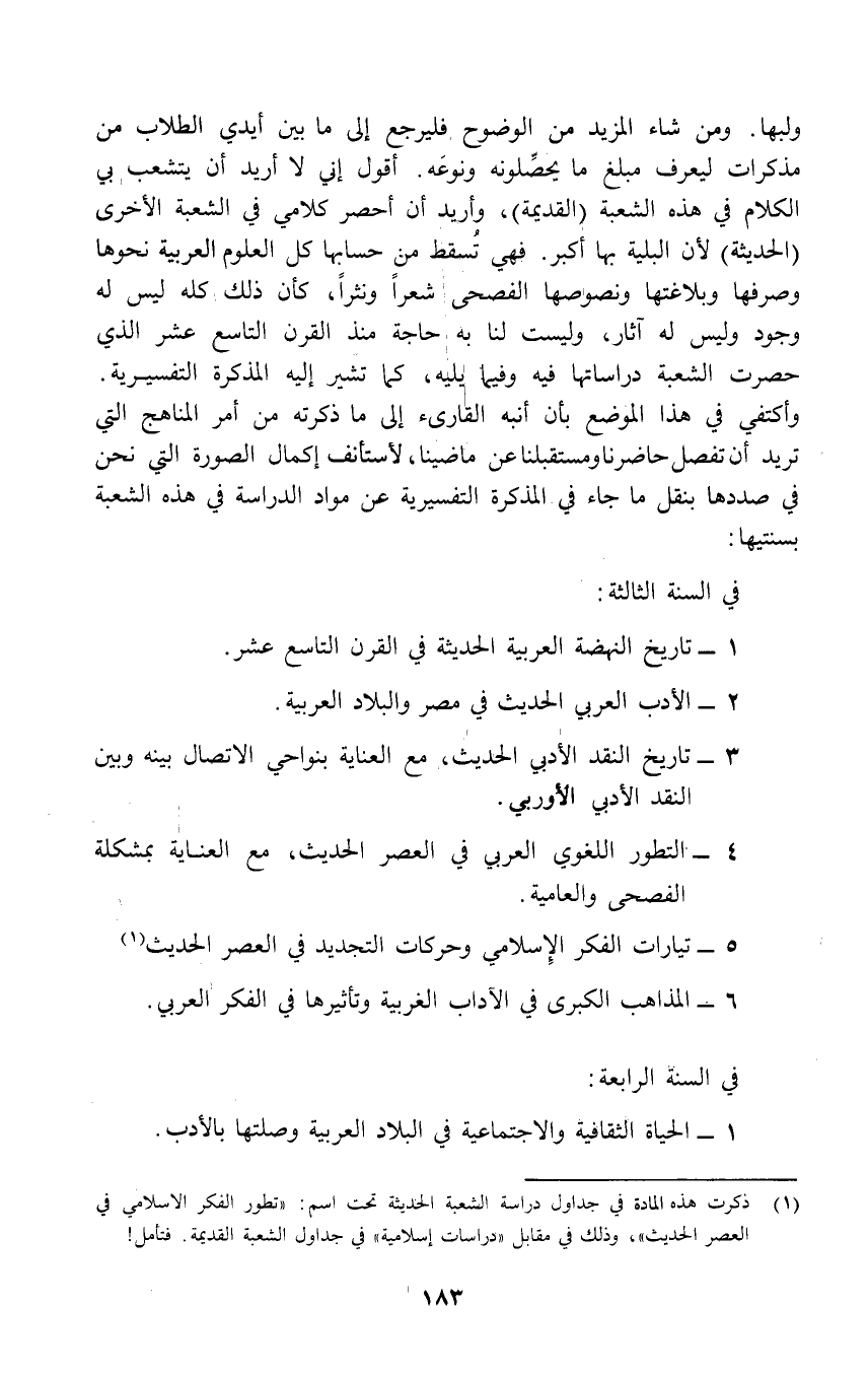 ولبها. ومن شاء المزيد من الوضوح فليرجع إلى ما بين أيدي الطلاب من مذكرات ليعرف مبلغ ما يحصِّلونه ونوعَه. أقول إني لا أريد أن يتشعب بي الكلام في هذه الشعبة (القديمة)، وأريد أن أحصر كلامي في الشعبة الأخرى (الحديثة) لأن البلية بها أكبر. فهي تُسقط من حسابها كل العلوم العربية نحوها وصرفها وبلاغتها ونصوصها الفصحى شعراً ونثراً، كأن ذلك كله ليس له وجود وليس له آثار، وليست لنا به حاجة منذ القرن التاسع عشر الذي حصرت الشعبة دراساتها فيه وفيما يليه، كما تشير إليه المذكرة التفسيرية. وأكتفي في هذا الموضع بأن أنبه القارئ إلى ما ذكرته من أمر المناهج التي تريد أن تفصل حاضرنا ومستقبلنا عن ماضينا، لأستأنف إكمال الصورة التي نحن في صددها بنقل ما جاء في المذكرة التفسيرية عن مواد الدراسة في هذه الشعبة بسنتيها: