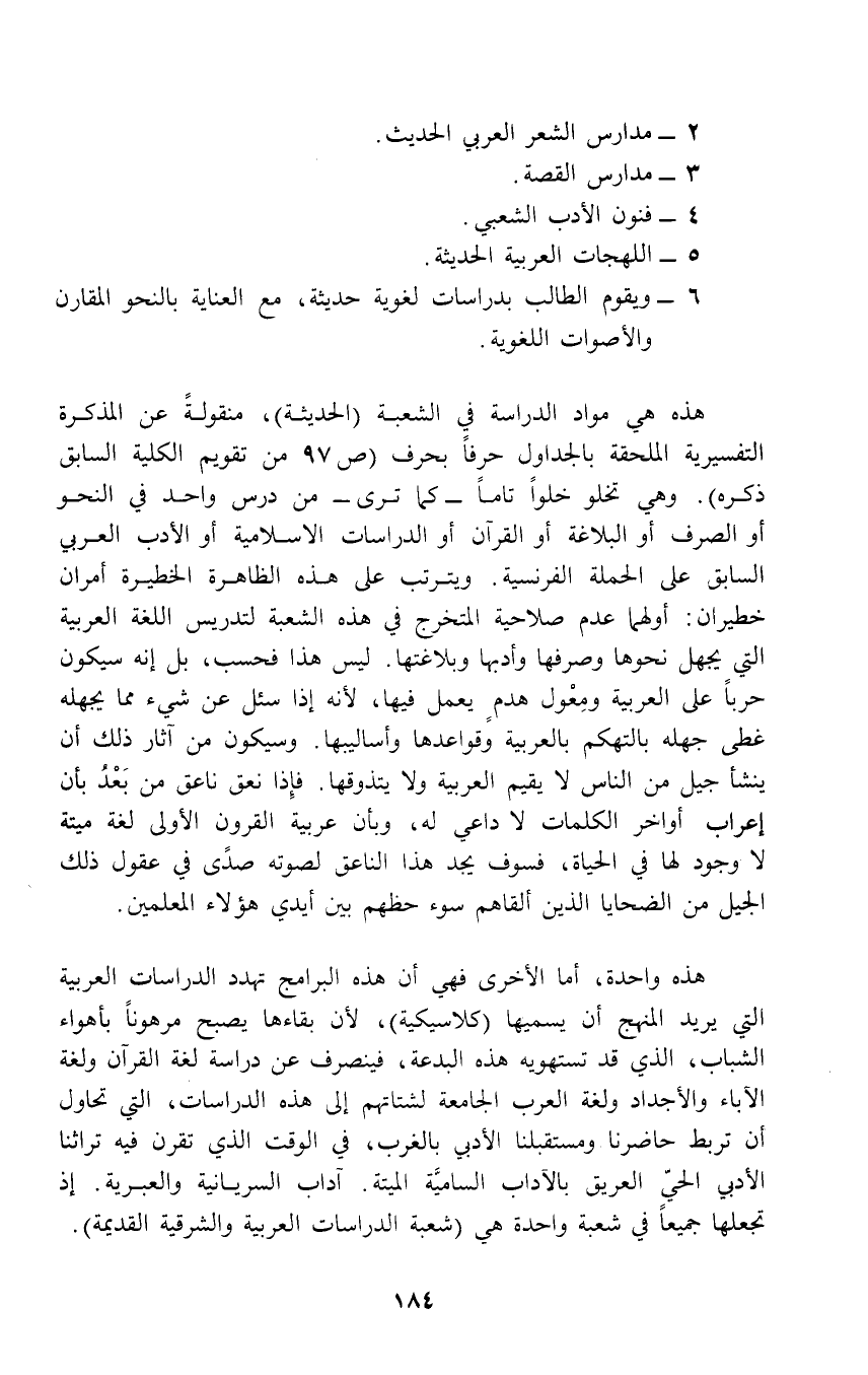 هذه هي مواد الدراسة في الشعبة (الحديثة)، منقولةً عن المذكرة التفسيرية الملحقة بالجداول حرفاً بحرف (ص 97 من تقويم الكلية السابق ذكره). وهي تخلو خلواً تاماً - كما ترى - من درس واحد في النحو أو الصرف أو البلاغة أو القرآن أو الدراسات الإِسلامية أو الأدب العربي السابق على الحملة الفرنسية. ويترتب على هذه الظاهرة الخطيرة أمران خطيران: أولهما عدم صلاحية التخرج في هذه الشعبة لتدريس اللغة العربية التي يجهل نحوها وصرفها وأدبها وبلاغتها. ليس هذا فحسب، بل إنه سيكون حرباً على العربية ومِعْول هدمٍ يعمل فيها, لأنه إذا سئل عن شيء مما يجهده غطى جهله بالتهكم بالعربية وقواعدها وأساليبها. وسيكون من آثار ذلك أن ينشأ جيل من الناس لا يقيم العربية ولا يتذوقها. فإِذا نعق ناعق من بَعْدُ بأن إعراب أواخر الكلمات لا داعي له، وبأن عربية القرون الأولى لغة ميتة لا وجود لها في الحياة، فسوف يجد هذا الناعق لصوته صدًى في عقول ذلك الجيل من الضحايا الذين ألقاهم سوء حظهم بين أيدي هؤلاء المعلمين.