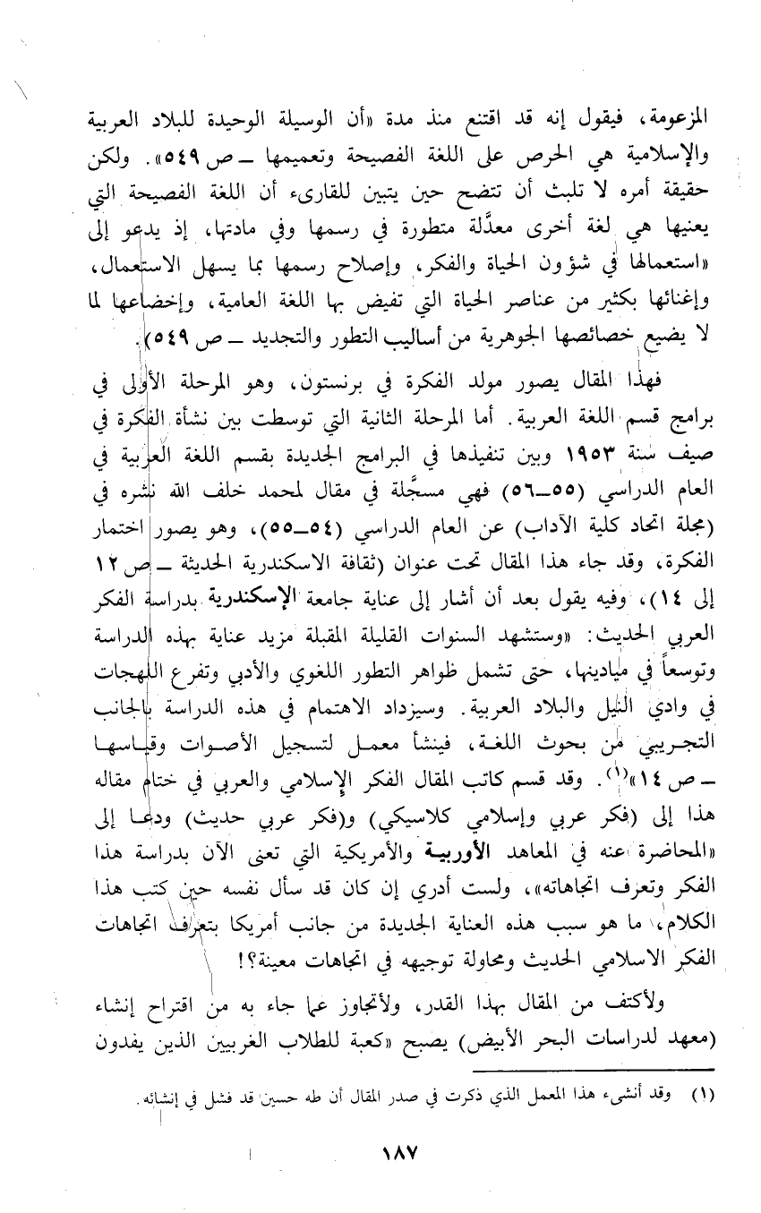 فهذا المقال يصور مولد الفكرة في برنستون، وهو المرحلة الأولى في برامج قسم اللغة العربية. أما المرحلة الثانية التي توسطت بين نشأة الفكرة في صيف سنة 1953 وبين تنفيذها في البرامج الجديدة بقسم اللغة العربية في العام الدراسي (55 - 56) فهي مسجَّلة في مقال لمحمد خلف الله نشره في (مجلة اتحاد كلية الآداب) عن العام الدراسي (54 - 55)، وهو يصور اختمار الفكرة، وقد جاء هذا المقال تحت عنوان (ثقافة الاسكندرية الحديثة - ص12 إلى 14)، وفيه يقول بعد أن أشار إلى عناية جامعة؟ الإسكندرية بدراسة الفكر العربي الحديث: "وستشهد السنوات القليلة المقبلة مزيد عناية بهذه الدراسة وتوسعاً في ميادينها، حتى تشمل ظواهر التطور اللغوي والأدبي وتفرع اللهجات في وادي النيل والبلاد العربية. وسيزداد الاهتمام في هذه الدراسة بالجانب التجريبي من بحوث اللغة، فينشأ معمل لتسجيل الأصوات وقياسها - ص 14" (¬1). وقد قسم كاتب المقال الفكر الإِسلامي والعربي في ختام مقاله هذا إلى (فكر عربي وإسلامي كلاسيكي) و (فكر عربي حديث) ودعا إلى "المحاضرة عنه في المعاهد الأوربية والأمريكية التي تعنى الآن بدراسة هذا الفكر وتعرف اتجاهاته"، ولست أدري إن كان قد سأل نفسه حين كتب هذا الكلام، ما هو سبب هذه العناية الجديدة من جانب أمريكا بتعرف اتجاهات الفكر الإِسلامي الحديث ومحاولة توجيهه في اتجاهات معينة؟!