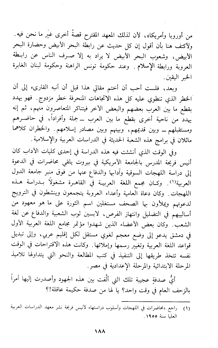 وبعد، فلست أحب أن أختم مقالي هذا قبل أن أنبه القارئ إلى أن الخطر الذي تنطوي عليه كل هذه الاتجاهات المنحرفة خطر مزدوج. فهو يهدد بقطع ما بين العرب بعضهم والبعض الآخر فيتناكر المتعاصرون منهم، ثم إنه يهدد من ناحية أخرى بقطع ما بين العرب - جملة وأفراداً، في حاضرهم ومستقبلهم - وبين قديمهم، وبينهم وبين مصادر إسلامهم. والخطران كلاهما ماثلان في برامج هذه الشعبة الحديثة في الدراسات العربية والإِسلامية.