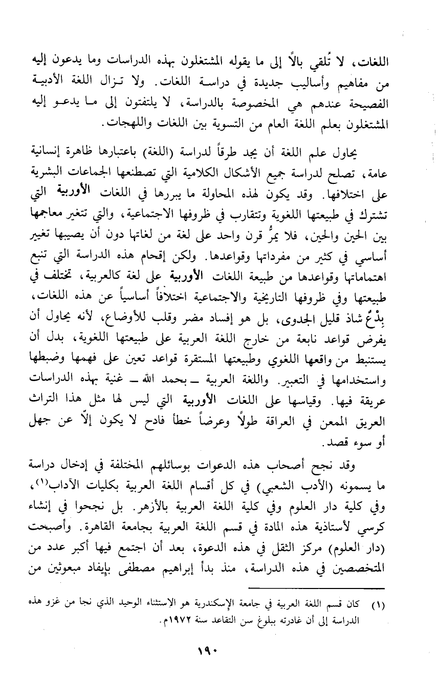 يحاول علم اللغة أن يجد طرقاً لدراسة (اللغة) باعتبارها ظاهرة إنسانية عامة، تصلح لدراسة جغ الأشكال الكلامية التي تصطنعها الجماعات البشرية على اختلافها. وقد يكون لهذه المحاولة ما يبررها في اللغات الأوربية التي تشترك في طبيعتها اللغوية وتتقارب في ظروفها الاجتماعية، والتي تتغير معاجمها بين الحين والحين، فلا يمر قرن واحد على لغة من لغاتها دون أن يصيبها تغيير أساسي في كثير من مفرداتها وقواعدها. ولكن إقحام هذه الدراسة التي تنبع اهتماماتها وقواعدها من طبيعة اللغات الأوربية على لغة كالعربية، تختلف في طبيعتها وفي ظروفها التاريخية والاجتماعية اختلافاً أساسياً عن هذه اللغات، بِدْعٌ شاذ قليل الجدوى، بل هو إفساد مضر وقلب للأوضاع, لأنه يحاول أن يفرض قواعد نابعة من خارج اللغة العربية على طبيعتها اللغوية، بدل أن يستنبط من واقعها اللغوي وطبيعتها المستقرة قواعد تعين على فهمها وضبطها واستخدامها في التعبير. واللغة العربية - بحمد الله - غنية بهذه الدراسات عريقة فيها. وقياسها على اللغات الأوربية التي ليس لها مثل هذا التراث العريق الممعن في العراقة طولاً وعرضاً خطأ فادح لا يكون إلَّا عن جهل أو سوء قصد.