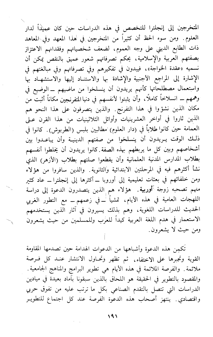 المتخرجين إلى إنجلترا للتخصص في هذه الدراسات حين كان عميداً لدار العلوم. ومن سوء الحظ أن كثيراً من المتخرجين في هذا المعهد وفي المعاهد ذات الطابع الديني على وجه العموم، لضعف شخصياتهم وفقدانهم الاعتزاز بصفتهم العربية والإِسلامية، يحكم تصرفاتهم شعور عميق بالنقص يمكن أن نسميه "عقدة الخواجة"، فيبدون في تفكيرهم وفي تصرفاتهم وفي مبالغتهم في الإِشارة إلى المراجع الأجنبية والإِشادة بها والاستناد إليها والاستشهاد بها واستعمال مصطلحاتها كأنهم يريدون أن ينسلخوا من ماضيهم - الوضيع في وهمهم - انسلاخاً كاملاً، وأن يثبتوا لأنفسهم في دنيا المتفرنجين مكاناً أثبت من مكان الذين نشؤوا في هذا التفرنج. والذين يتصرفون على هذا النحو هم الذين ثاروا في أواخر العشرينيات وأوائل الثلاثينيات من هذا القرن على العمامة حين كانوا طلاباً في (دار العلوم) مطالبين بلبس (الطربوش). كانوا في ذلك الوقت يريدون أن ينسلخوا من صفتهم الدينية وأن يباعدوا بين أشخاصهم وبين كل ما يربطهم بهذه الصفة. كانوا يريدون أن يخلطوا أنفسهم بطلاب المدارس المدنية العلمانية وأن يقطعوا صلتهم بطلاب (الأزهر) الذي نشأ أكثرهم فيه في المرحلتين الابتدائية والثانوية. والذين سافروا من هؤلاء ومن خلفائهم في بعثات تعليمية إلى أوروبا - أكثرها إلى إنجلترا - عاد كثير منهم تصحبه زوجة أوربية. هؤلاء همِ الذين يتصدرون الدعوة إلى دراسة اللهجات العامية في هذه الأيام، تمشياً - في زعمهم - مع التطور الغربي الحديث للدراسات اللغوية، وهم بذلك يسيرون في آثار الذين يستخدمهم الاستعمار في هدم اللغة العربية كيداً للعرب وللمسلمين من حيث يشعرون ومن حيث لا يشعرون.