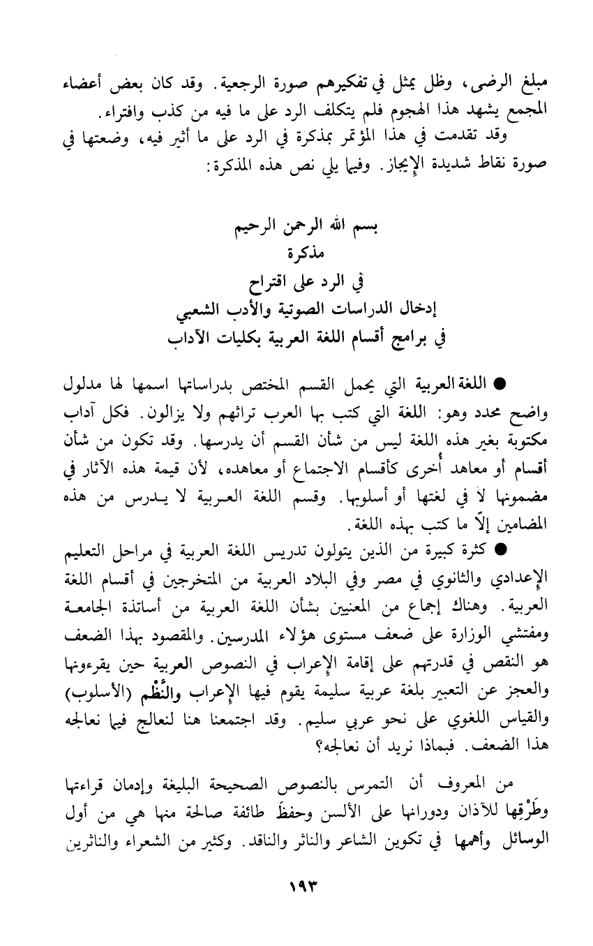 مبلغ الرضى، وظل يمثل في تفكيرهم صورة الرجعية. وقد كان بعض أعضاء المجمع يشهد هذا الهجوم فلم يتكلف الرد على ما فيه من كذب وافتراء. وقد تقدمت في هذا المؤتمر بمذكرة في الرد على ما أثير فيه، وضعتها في صورة نقاط شديدة الِإيجاز. وفيما يلي نص هذه المذكرة: