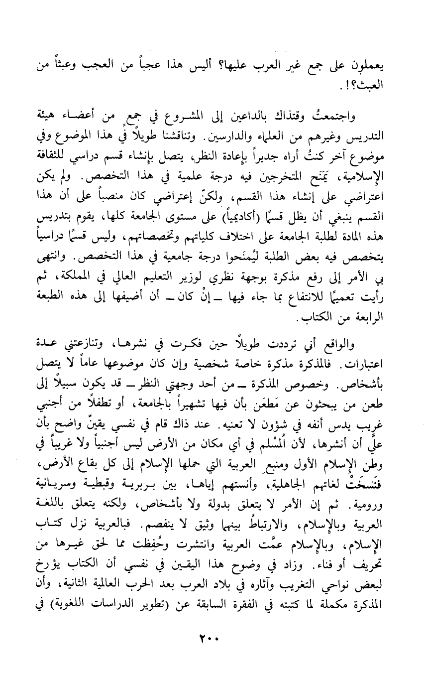 واجتمعتُ وقتذاك بالداعين إلى المشروع في جمعٍ من أعضاء هيئة التدريس وغيرهم من العلماء والدارسين. وتناقشنا طويلاً في هذا الموضوع وفي موضوع آخر كنتُ أراه جديراً بإِعادة النظر، يتصل بإِنشاء قسم دراسي للثقافة الإِسلامية، يَمَنَح المتخرجين فيه درجة علمية في هذا التخصص. ولم يكن اعتراضي على إنشاء هذا القسم، ولكنّ إعتراضي كان منصباً على أن هذا القسم ينبغي أن يظل قسمًا (أكاديمياً) على مستوى الجامعة كلها، يقوم بتدريس هذه المادة لطلبة الجامعة على اختلاف كلياتهم وتخصصاتهم، وليس قسمًا دراسياً يتخصص فيه بعض الطلبة ليُمنَحوا درجة جامعية في هذا التخصص. وانتهى بي الأمر إلى رفع مذكرة بوجهة نظري لوزير التعليم العالي في المملكة، ثم رأيت تعميمًا للانتفاع بما جاء فيها - إنْ كان - أن أضيفها إلى هذه الطبعة الرابعة من الكتاب.