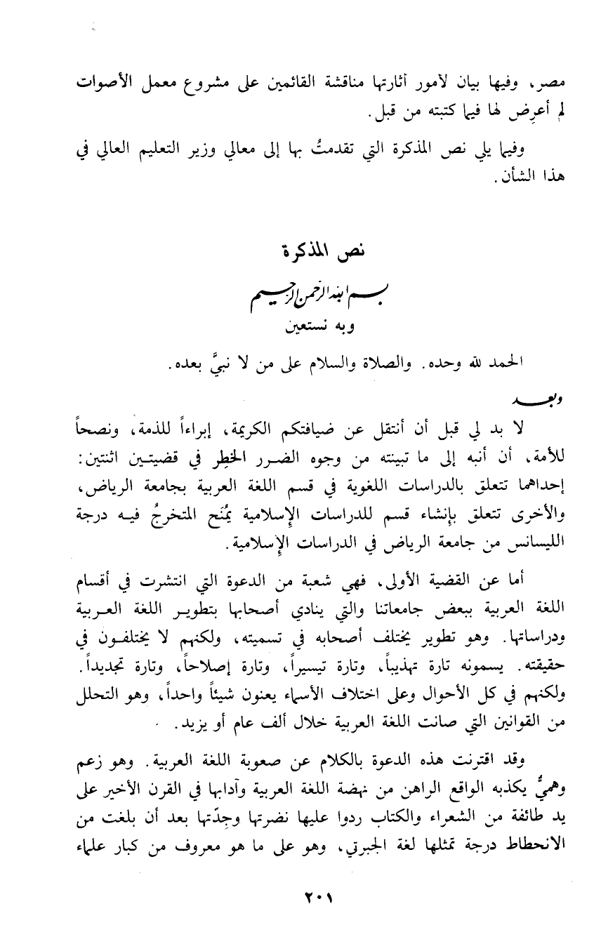 لا بد لي قبل أن أنتقل عن ضيافتكم الكريمة، إبراءاً للذمة، ونصحاً للأمة، أن أنبه إلى ما تبينته من وجوه الضرر الخطِر في قضيتين اثنتين: إحداهما تتعلق بالدراسات اللغوية في قسم اللغة العربية بجامعة الرياض، والأخرى تتعلق بإِنشاء قسم للدراسات الإِسلامية يمُنَح المتخرجُ فيه درجة الليسانس من جامعة الرياض في الدراسات الإِسلامية.