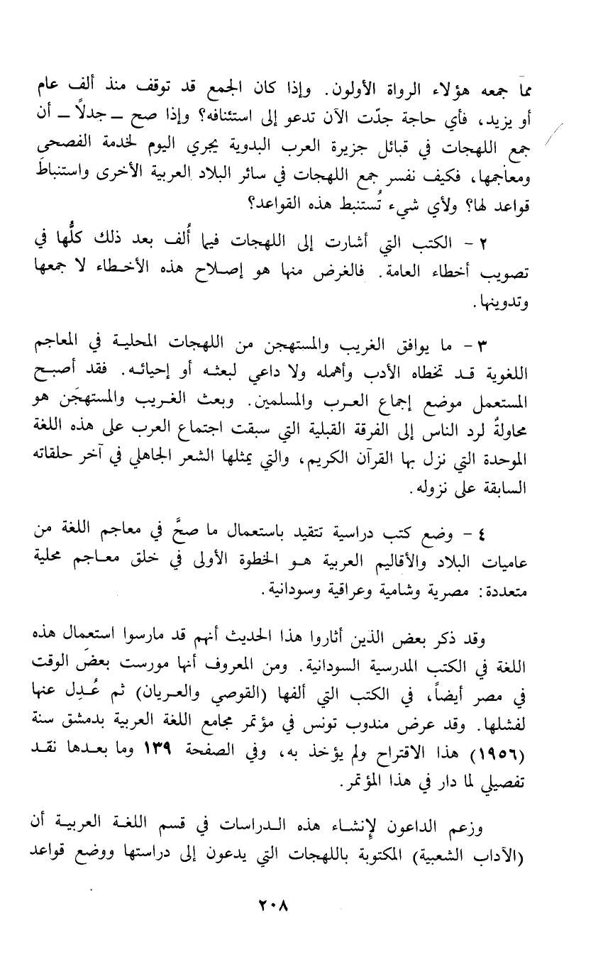 مما جمعه هؤلاء الرواة الأولون. وإذا كان الجمع قد توقف منذ ألف عام أو يزيد، فأي حاجة جدّت الآن تدعو إلى استئنافه؟ وإذا صح - جدلاً - أن جمع اللهجات في قبائل جزيرة العرب البدوية يجري اليوم لخدمة الفصحى ومعاجمها، فكيف نفسر جمع اللهجات في سائر البلاد العربية الأخرى واستنباطَ قواعد لها؟ ولأي شيء تُستنبط هذه القواعد؟