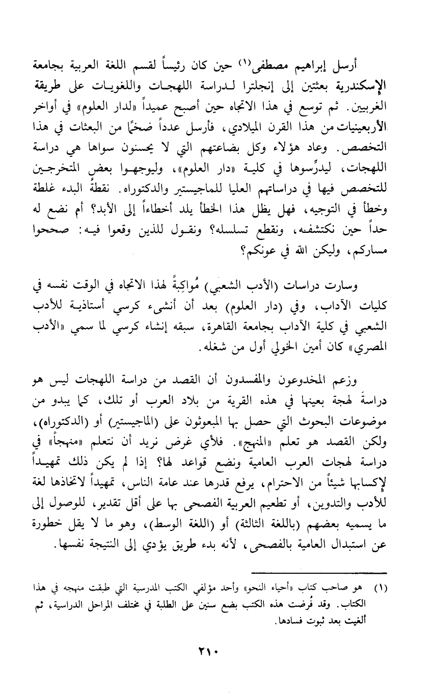 أرسل إبراهيم مصطفى (¬1) حين كان رئيساً لقسم اللغة العربية بجامعة الإِسكندرية بعثتين إلى إنجلترا لدراسة اللهجات واللغويات على طريقة الغربيين. ثم توسع في هذا الاتجاه حين أصبح عميداً "لدار العلوم" في أواخر الأربعينيات من هذا القرن الميلادي، فأرسل عدداً ضخمًا من البعثات في هذا التخصص. وعاد هؤلاء وكل بضاعتهم التي لا يحسنون سواها هي دراسة اللهجات، ليدرِّسوها في كلية "دار العلوم"، وليوجهوا بعض المتخرجين للتخصص فيها في دراساتهم العليا للماجيستير والدكتوراه. نقطةُ البدء غلطة وخطأ في التوجيه، فهل يظل هذا الخطأ يلد أخطاءاً إلى الأبد؟ أم نضع له حداً حين نكتشفه، ونقطع تسلسله؟ ونقول للذين وقعوا فيه: صححوا مساركم، وليكن الله في عونكم؟