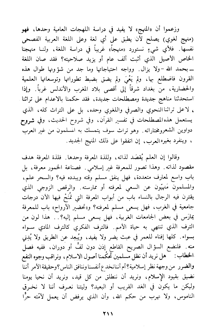 وقالوا إن العلم يُقصَد لذاته، وللذة المعرفة وحدها. فلذة المعرفة هدف مقصود لذاته. وهذا تصور للمعرفة غير إسلامي. فصناعة الخمور معرفة، بل باب واسع لعارف متعددة، فهل ينفق مسلم وقته ويبدده فيه؟ والسحر علم، والمسلمون مَنهيّون عن السعي لمعرفته أو ممارسته. والرقص الزوجي الذي يقترن فيه الرجال بالنساء باب من أبواب المعرفة التي تمُنَحْ فيها الآن درجات جامعية في الغرب، فهل يسعى مسلم لمعرفته؟ و"تحضير الأرواح" باب للمعرفة يمارَس في بعض الجامعات الغربية، فهل يسعى مسلم إليه؟ .. هذا لون من الترف الذي تنتهي به حياة الأمم. فالترف الفكري كالترف المادي سواء بسواء. كلها إفناء للعمر في عبث يضر ولا يفيد، ويُبعِد عن الطريق ولا يُدِني منه. فلنضع السؤال الصريح القاطع إذن دون لفٍّ أو دوران، ففيه فصل الخطاب: هل نريد أن نظل مسلمين تحكُمنا أصول الاسلام، ونراقب وجوه النفع والضرر من وجهة نظر إسلامية؟ أم أننا نخدع أنفسنا وننافق الناس؟ وحقيقة الأمر أننا نضيق بقيود الإِسلام، ونريد أن ننطلق من كل قيد، ونريد أن نحيا يومنا وليكن ما يكون في الغد القريب أو البعيد؟ وليتنا نعرف أننا لا نخرق الناموس، ولا نهرب من حكم الله، وأن الذي يرفض أن يعمل لأمّته حرًّا
