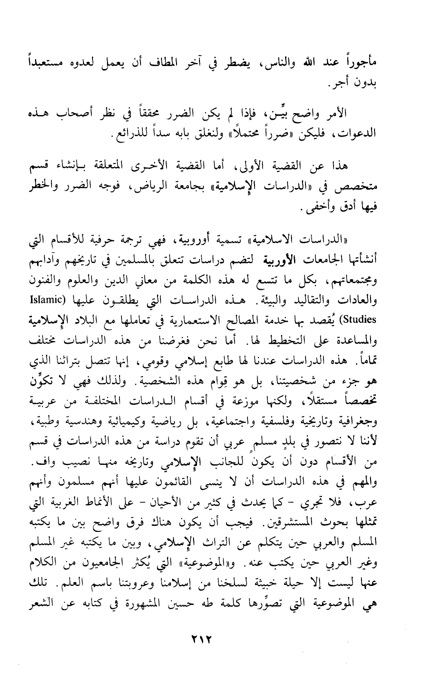 هذا عن القضية الأولى، أما القضية الأخرى المتعلقة بإنشاء قسم متخصص في "الدراسات الإِسلامية" بجامعة الرياض، فوجه الضرر والخطر فيها أدق وأخفى.