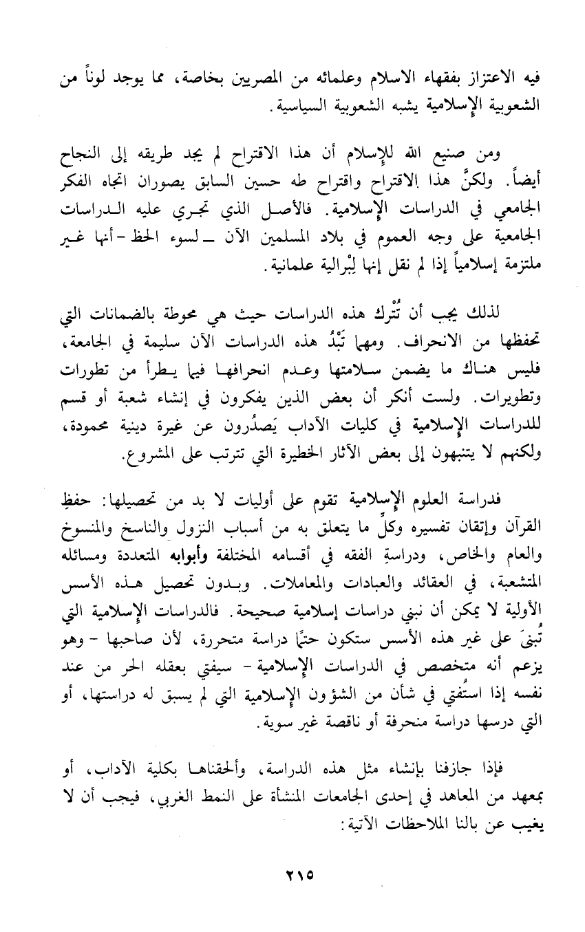 ومن صنيع الله للإِسلام أن هذا الاقتراح لم يجد طريقه إلى النجاح أيضاً. ولكن هذا. الاقتراح واقتراح طه حسين السابق يصوران اتجاه الفكر الجامعي في الدراسات الإِسلامية. فالأصل الذي تجري عليه الدراسات الجامعية على وجه العموم في بلاد المسلمين الآن - لسوء الحظ - أنها غير ملتزمة إسلامياً إذا لم نقل إنها لِبْرالية علمانية.