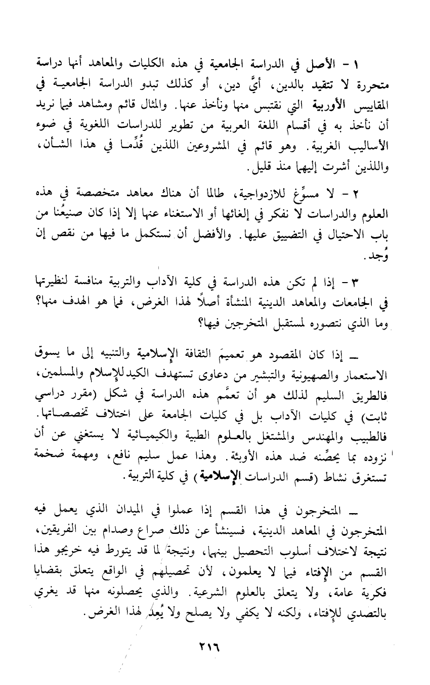 1 - الأصل في الدراسة الجامعية في هذه الكليات والمعاهد أنها دراسة متحررة لا تتقيد بالدين، أيَّ دين، أو كذلك تبدو الدراسة الجامعية في المقاييس الأوربية التي نقتبس منها ونأخذ عنها. والمثال قائم ومشاهد فيما نريد أن نأخذ به في أقسام اللغة العربية من تطوير للدراسات اللغوية في ضوء الأساليب الغربية. وهو قائم في المشروعين اللذين قُدِّما في هذا الشأن، واللذين أشرت إليهما منذ قليل.