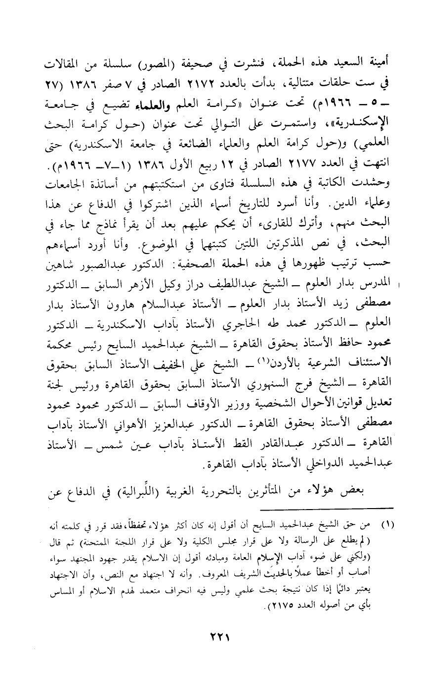 أمينة السعيد هذه الحملة، فنشرف في صحيفة (المصور) سلسلة من المقالات في ست حلقات متتالية، بدأت بالعدد 2172 الصادر في 7 صفر 1386 (27 - 5 - 1966 م) تحت عنوان "كرامة العلم والعلماء تضيع في جامعة الإِسكندرية"، واستمرت على التوالي تحت عنوان (حول كرامة البحث العلمي) و (حول كرامة العلم والعلماء الضائعة في جامعة الاسكندرية) حتى انتهت في العدد 2177 الصادر في 12 ربجع الأول 1386 (1 - 7 - 1966 م). وحشدت الكاتبة في هذه السلسلة فتاوى من استكتبتهم من أساتذة الجامعات وعلماء الدين. وأنا أسرد للتاريخ أسماء الذين اشتركوا في الدفاع عن هذا البحث منهم، وأترك للقارىء أن يحكم عليهم بعد أن يقرأ نماذج مما جاء في البحث، في نص المذكرتين اللتين كتبتهما في الموضوع. وأنا أورد أسماءهم حسب ترتيب ظهورها في هذه الحملة الصحفية: الدكتور عبد الصبور شاهين المدرس بدار العلوم - الشيخ عبد اللطيف دراز وكيل الأزهر السابق - الدكتور مصطفى زيد الأستاذ بدار العلوم - الأستاذ عبد السلام هارون الأستاذ بدار العلوم - الدكتور مُحَمَّدْ طه الحاجري الأستاذ بآداب الاسكندرية - الدكتور محمود حافظ الأستاذ بحقوق القاهرة - الشيخ عبد الحميد السايح رئيس محكمة الاستئناف الشرعية بالأردن (¬1) - الشيخ علي الخفيف الأستاذ السابق بحقوق القاهرة - الشيخ فرج السنهوري الأستاذ السابق بحقوق القاهرة ورئيس لجنة تعديل قوانين الأحوال الشخصية ووزير الأوقاف السابق - الدكتور محمود محمود مصطفى الأستاذ بحقوق القاهرة - الدكتور عبد العزيز الأهواني الأستاذ بآداب القاهرة - الدكتور عبد القادر القط الأستاذ بآداب عين شمس - الأستاذ عبد الحميد الدواخلي الأستاذ بآداب القاهرة.