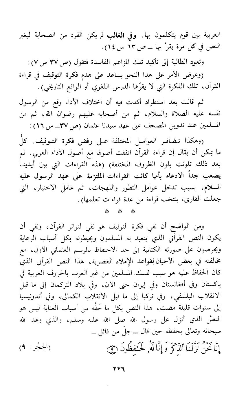 ومن الواضح أن نفي فكرة التوقيف هو نفي لتواتر القرآن، ونفي أن يكون النص القرآني الذي يتعبد به المسلمون ويحيطونه بكل أسباب الرعاية ويحرصون على صورته الكتابية إلى حد الاحتفاظ بالرسم العثماني الأول، مع مخالفته في بعض الأحيان لقواعد الإِملاء العصرية، هذا النص القرآني الذي كان الحفاظ عليه هو سبب تمسك المسلمين من غير العرب بالحروف العربية في باكستان وفي أفغانستان وفي إيران حتى الآن، وفي بلاد التركمان إلى ما قبل الانقلاب البلشفي، وفي تركيا إلى ما قبل الانقلاب الكمالي، وفي أندونيسيا إلى سنوات قليلة مضت، هذا النص بكل ما حَفَّه من أسباب العناية ليس هو النصَّ الذي أنزل على رسول الله صلى الله عليه وسلم، والذي وعد الله سبحانه وتعالى بحفظه حين قال - جلّ من قال -