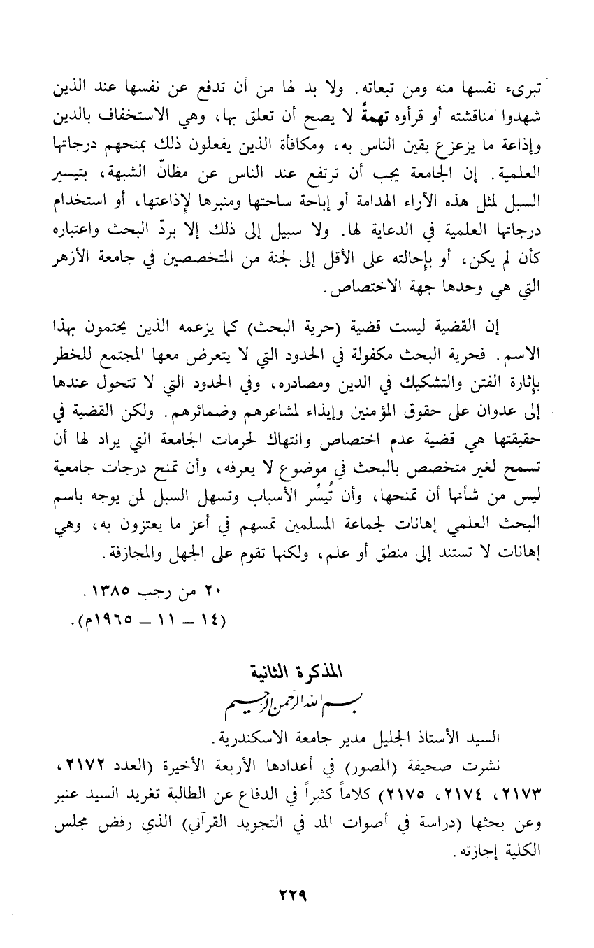 تبرىء نفسها منه ومن تبعاته. ولا بد لها من أن تدفع عن نفسها عند الذين شهدوا مناقشته أو قرأوه تهمةً لا يصح أن تعلق بها، وهي الاستخفاف بالدين وإذاعة ما يزعزع يقين الناس به، ومكافأة الذين يفعلون ذلك بمنحهم درجاتها العلمية. إن الجامعة يجب أن ترتفع عند الناس عن مظانّ الشبهة، بتيسير السبل لمثل هذه الآراء الهدامة أو إباحة ساحتها ومنبرها لإِذاعتها، أو استخدام درجاتها العلمية في الدعاية لها. ولا سبيل إلى ذلك إلا بردّ البحث واعتباره كأن لم يكن، أو بإِحالته على الأقل إلى لجنة من المتخصصين في جامعة الأزهر التي هي وحدها جهة الاختصاص.