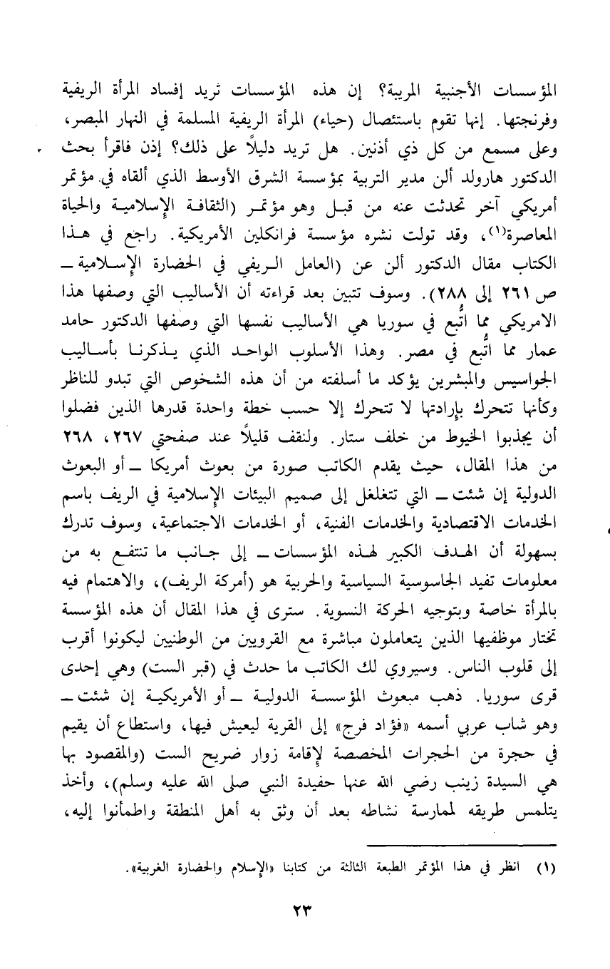 المؤسسات الأجنبية المريبة؟ إن هذه المؤسسات تريد إفساد المرأة الريفية وفرنجتها. إنها تقوم باستئصال (حياء) المرأة الريفية المسلمة في النهار المبصر، وعلى مسمع من كل ذي أذنين. هل تريد دليلاً على ذلك؟ إذن فاقرأ بحث الدكتور هارولد ألن مدير التربية بمؤسسة الشرق الأوسط الذي ألقاه في مؤتمر أمريكي آخر تحدثت عنه من قبل وهو مؤتمر (الثقافة الإِسلامية والحياة المعاصرة (¬1)، وقد تولت نشره مؤسسة فرانكلين الأمريكية. راجع في هذا الكتاب مقال الدكتور ألن عن (العامل الريفي في الحضارة الإِسلامية - ص 261 إلى 288). وسوف تتبين بعد قراءته أن الأساليب التي وصفها هذا الامريكي مما اتُّبع في سوريا هي الأساليب نفسها التي وصفها الدكتور حامد عمار مما أتُّبع في مصر. وهذا الأسلوب الواحد الذي يذكرنا بأساليب الجواسيس والمبشرين يؤكد ما أسلفته من أن هذه الشخوص التي تبدو للناظر وكأنها تتحرك بإِرادتها لا تتحرك إلا حسب خطة واحدة قدرها الذين فضلوا أن يجذبوا الخيوط من خلف ستار. ولنقف قليلاً عند صفحتي 267، 268 من هذا المقال، حيث يقدم الكاتب صورة من بعوث أمريكا - أو البعوث الدولية إن شئت - التي تتغلغل إلى صميم البيئات الإِسلامية في الريف باسم الخدمات الاقتصادية والخدمات الفنية، أو الخدمات الاجتماعية، وسوف تدرك بسهولة أن الهدف الكبير لهذه المؤسسات - إلى جانب ما تنتفع به من معلومات تفيد الجاسوسية السياسية والحربية هو (أمركة الريف)، والاهتمام فيه بالمرأة خاصة وبتوجيه الحركة النسوية. سترى في هذا المقال أن هذه المؤسسة تختار موظفيها الذين يتعاملون مباشرة مع القرويين من الوطنيين ليكونوا أقرب إلى قلوب الناس. وسيروي لك الكاتب ما حدث في (قبر الست) وهي إحدى قرى سوريا. ذهب مبعوث المؤسسة الدولية - أو الأمريكية إن شئت - وهو شاب عربي أسمه "فؤاد فرج" إلى القرية ليعيش فيها، واستطاع أن يقيم في حجرة من الحجرات المخصصة لِإقامة زوار ضريح الست (والمقصود بها هي السيدة زينب رضي الله عنها حفيدة النبي صلى الله عليه وسلم)، وأخذ يتلمس طريقه لممارسة نشاطه بعد أن وثق به أهل المنطقة واطمأنوا إليه،