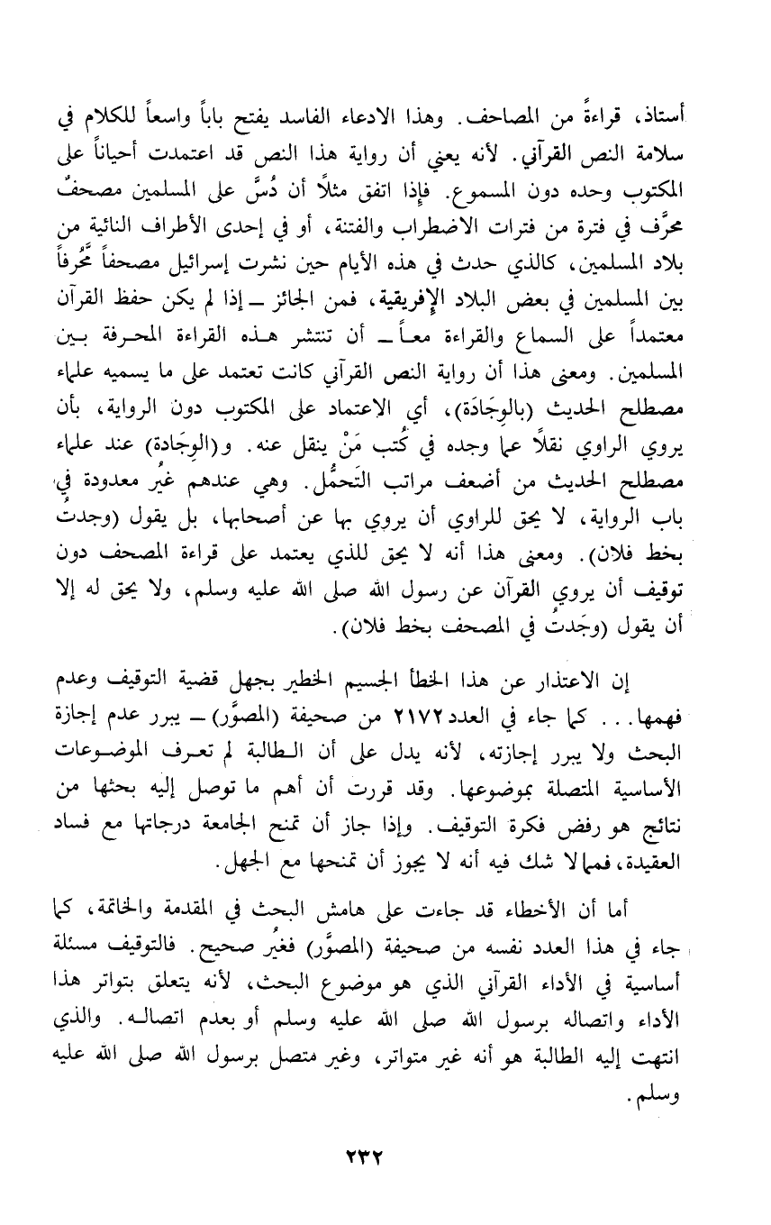 أستاذ، قراءةً من المصاحف. وهذا الادعاء الفاسد يفتح باباً واسعاً للكلام في سلامة النص القرآني. لأنه يعني أن رواية هذا النص قد اعتمدت أحياناً على المكتوب وحده دون المسموع. فإِذا اتفق مثلاً أن دُسَّ على المسلمين مصحفٌ محرَّف في فترة من فترات الاضطراب والفتنة، أو في إحدى الأطراف النائية من بلاد المسلمين، كالذي حدث في هذه الأيام حين نشرت إسرائيل مصحفاً مُحرفاً بين المسلمين في بعض البلاد الإِفريقية، فمن الجائز - إذا لم يكن حفظ القرآن معتمداً على السماع والقراءة معاً - أن تنتشر هذه القراءة المحرفة بين المسلمين. ومعنى هذا أن رواية النص القرآني كانت تعتمد على ما يسميه علماء مصطلح الحديث (بالوِجَادَة)، أي الإعتماد على المكتوب دون الرواية, بأن يروي الراوي نقلاً عما وجده في كُتب مَنْ ينقل عنه. و (الوِجَادة) عند علماء مصطلح الحديث من أضعف مراتب التَحمُّل. وهي عندهم غيُر معدودة في باب الرواية, لا يحق للراوي أن يروي بها عن أصحابها، بل يقول (وجدتُ بخط فلان). ومعنى هذا أنه لا يحق للذي يعتمد على قراءة الصحف دون توقيف أن يروي القرآن عن رسول الله صلى الله عليه وسلم، ولا يحق له إلا أن يقول (وجَدتُ في المصحف بخط فلان).