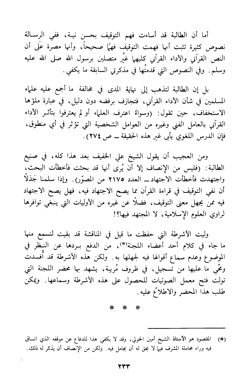 ومن العجيب أن يقول الشيخ علي الخفيف بعد هذا كله، في صنيع الطالبة: (فليس من الإِنصاف إلا أن يُرى أنها قد بحثت فأخطأت البحث، واجتهدت فأخطأت الاجتهاد - العدد 2175 من المصوّر). وإذا سلمنا جَدَلاً أن نفي التوقيف - في قراءة القرآن مما يصح الاجتهاد فيه، فهل يصح الاجتهاد فيه ممن يجهل معنى التوقيف، فضلاً عن غيره من الأوليات التي ينبغي توافرها لراوي العلوم الإِسلامية، لا المجتهد فيها؟!
