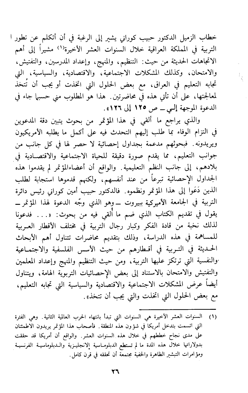 خطاب الزميل الدكتور حبيب كوراني يشير إلى الرغبة في أن أتكلم عن تطور التربية في المملكة العراقية خلال السنوات العشر الأخيرة (¬1) مشيراً إلى أهم الاتجاهات الحديثة من حيث: التنظيم، والمنهج، وإعداد المدرسين، والتفتيش، والامتحان، وكذلك المشكلات الاجتماعية، والاقتصادية، والسياسية، التي تجابه التعليم في العراق، مع بعض الحلول التي اتخذت أو يجب أن تُتخذ لمعالجتها، على أن تأتي هذه في محاضرتين. هذا هو المطلوب مني حسبما جاء في الدعوة الموجهة إلى- ص 125 إلى 126".