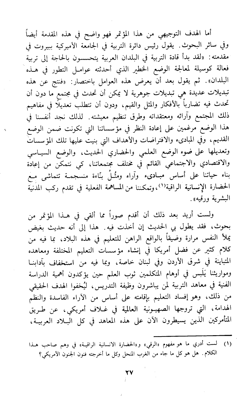 ولست أريد بعد ذلك أن أقدم صوراً مما ألقي في هذا المؤتمر من بحوث، فقد يطول بي الحديث إن أخذت فيه. هذا إلى أنه حديث بغيض يملأ النفس مرارة وضيقاً بالواقع الراهن للتعليم في هذه البلاد، بما فيه من كلام كثير عن فضل أمريكا في إنشاء مؤسسات التعليم المختلفة ومعاهده المتباينة في شرق الأردن وفي لبنان خاصة، وبما فيه من استخفاف بآدابنا ومواريثنا يَلَبس في أوهام المتكلمين ثوب العلم حين يؤكدون أهمية الدراسة الفنية في معاهد التربية لمن يباشرون وظيفة التدريس، ليُخفوا الهدف الحقيقي من ذلك، وهو إفساد التعليم بإِقامته على أساس من الآراء الفاسدة والنظم الهدامة، التي تروجها الصهيونية العالمية في غلاف أمريكي، عن طريق المتأمركين الذين يسيطرون الآن على هذه المعاهد في كل البلاد العربية،
