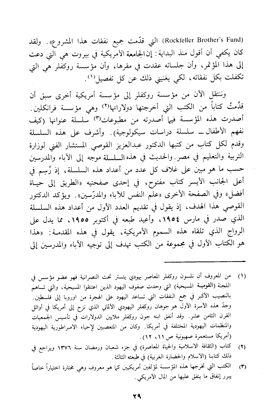 (Rockfeller Brother's Fund) التي قدّمت جميع نفقات هذا المشروع". ولقد كان يكفي أن أقول منذ البداية: إن الجامعة الأمريكية في بيروت هي التي دعت إلى هذا المؤتمر، وأن جلساته عقدت في مقرها، وأن مؤسسة روكفلر هي التي تكفلت بكل نفقاته، لكي يغنيني ذلك عن كل تفصيل (¬1).