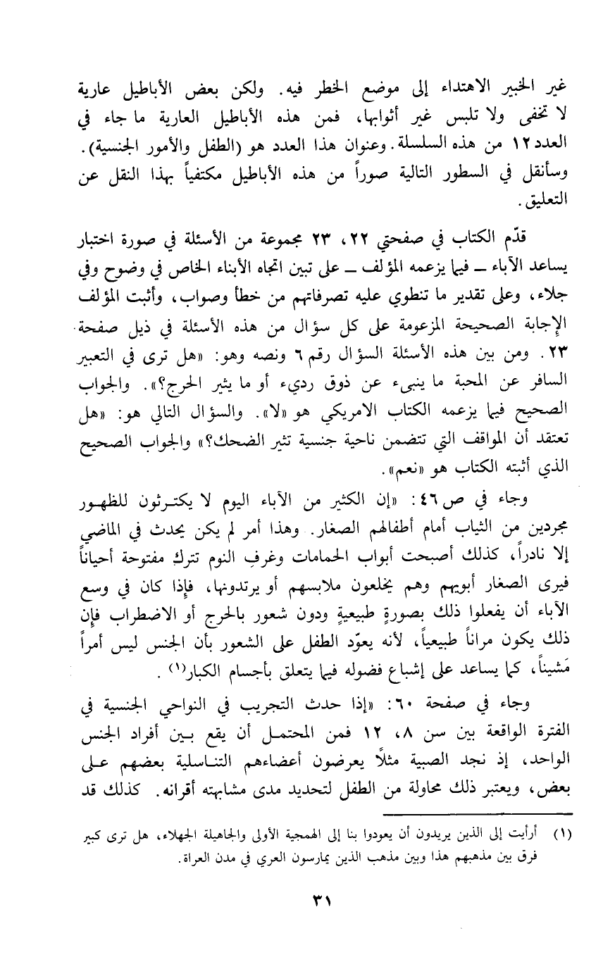 غير الخبير الاهتداء إلى موضع الخطر فيه. ولكن بعض الأباطيل عارية لا تخفى ولاتلبس غير أثوابها، فمن هذه الأباطيل العارية ما جاء في العدد 12 من هذه السلسلة. وعنوان هذا العدد هو (الطفل والأمور الجنسية). وسأنقل في السطور التالية صوراً من هذه الأباطيل مكتفياً بهذا النقل عن التعليق.