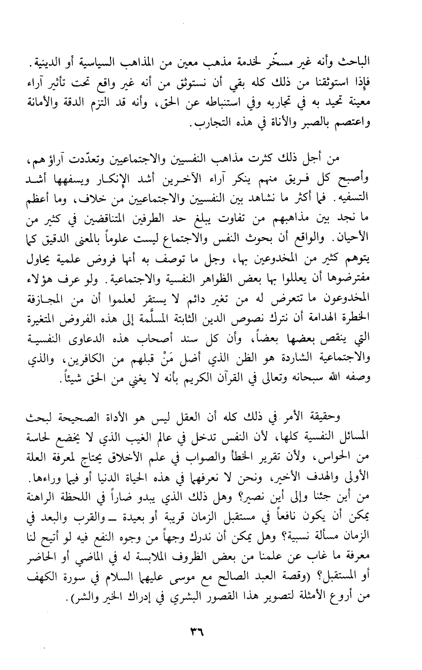 وحقيقة الأمر في ذلك كله أن العقل ليس هو الأداة الصحيحة لبحث المسائل النفسية كلها, لأن النفس تدخل في عالم الغيب الذي لا يخضع لحاسة من الحواس، ولأن تقرير الخطأ والصواب في علم الأخلاق يحتاج لمعرفة العلة الأولى والهدف الأخير، ونحن لا نعرفهما في هذه الحياة الدنيا أو فيما وراءها. من أين جئنا وإلى أين نصير؟ وهل ذلك الذي يبدو ضاراً في اللحظة الراهنة يمكن أن يكون نافعاً في مستقبل الزمان قريبة أو بعيدة - والقرب والبعد في الزمان مسألة نسبية؟ وهل يمكن أن ندرك وجهاً من وجوه النفع فيه لو أتيح لنا معرفة ما غاب عن علمنا من بعض الظروف الملابسة له في الماضي أو الحاضر أو المستقبل؟ (وقصة العبد الصالح مع موسى عليهما السلام في سورة الكهف من أروع الأمثلة لتصوير هذا القصور البشري في إدراك الخير والشر).
