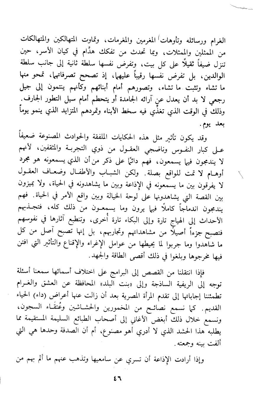 الغرام ورسائله وتأوهات المغرمين والمغرمات، وتماوت المتهالكين والمتهالكات من الممثلين والممثلات، وبما تحدث من تفكك هدَّام في كيان الأسر، حين تنزل ضيفاً ثقيلًا على كل بيت، وتفرض نفسها سلطة ثانية إلى جانب سلطة الوالدين، بل تفرض نفسها رقيباً عليهما، إذ تصحح تصرفاتهما، تمحو منها ما تشاء وتثبت ما تشاء، وتصورهم أمام أبنائهم وكانهم ينتمون إلى جيل رجعي لا بد أن يعدل عن آرائه الجامدة أو يتحطم أمام سيل التطور الجارف. وذلك في الوقت الذي تغذِّي فيه سخط الأبناء وتمردهم المتزايد الذي ينمو يوماً بعد يوم.