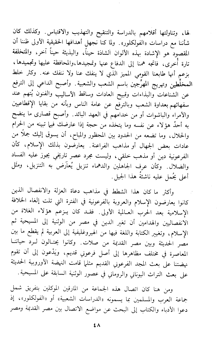 ومن هنا كان اتصال هذه الجماعة من المارقين الموكلين بتفريق شمل جماعة العرب والمسلمين بما يسمون "الدراسات الشعبية" أو "الفولكلور"، إذ دعوا الأدباء والكتاب إلى البحث عن مواضع الاتصال بين مصر القديمة ومصر