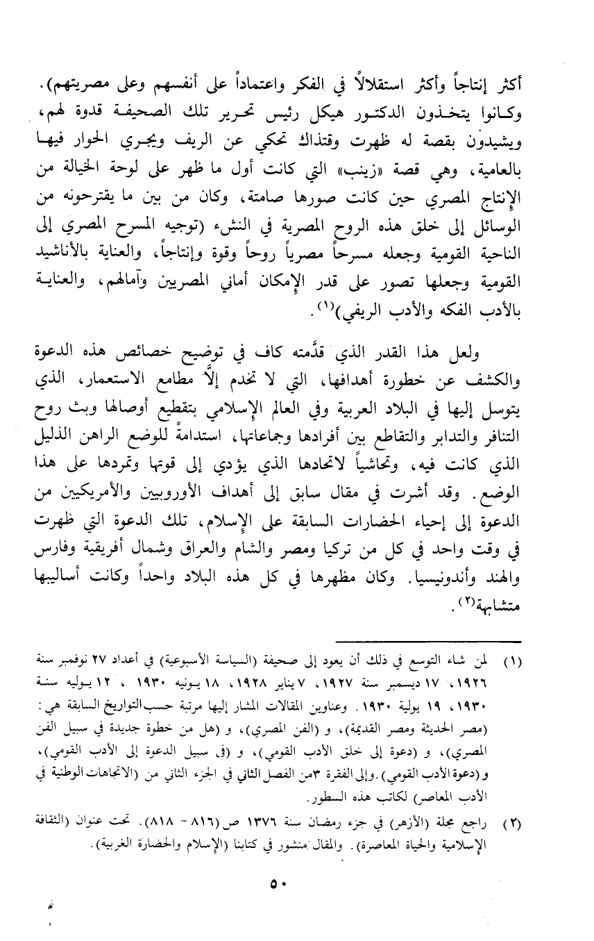 (¬1) لمن شاء التوسع في ذلك أن يعود إلى صحيفة (السياسة الأسبوعة) في أعداد 27 نوفمبر سنة 1926، 17 ديسمبر سنة 1927، 7 يناير 1928, 18 يونيه 1930، 12 يوليه سنة 1930، 19 يولية 1930. وعناوين المقالات المشار إليها مرتبة حسب التواريخ السابقة هي: (مصر الحديثة ومصر القديمة)، و (الفن المصري) , و (هل من خطوة جديدة في سبيل الفن الصرفى)، و (دعوة إلى خلق الأدب القومي) , و (في سبيل الدعوة إلى الأدب القومي)، و (دعوة الأدب القومىِ). وإلى الفقرة 3من الفصل الثاني في الجزء الثاني من (الاتجاهات الوطنية في الأدب المعاصر) لكاتب هذه السطور.