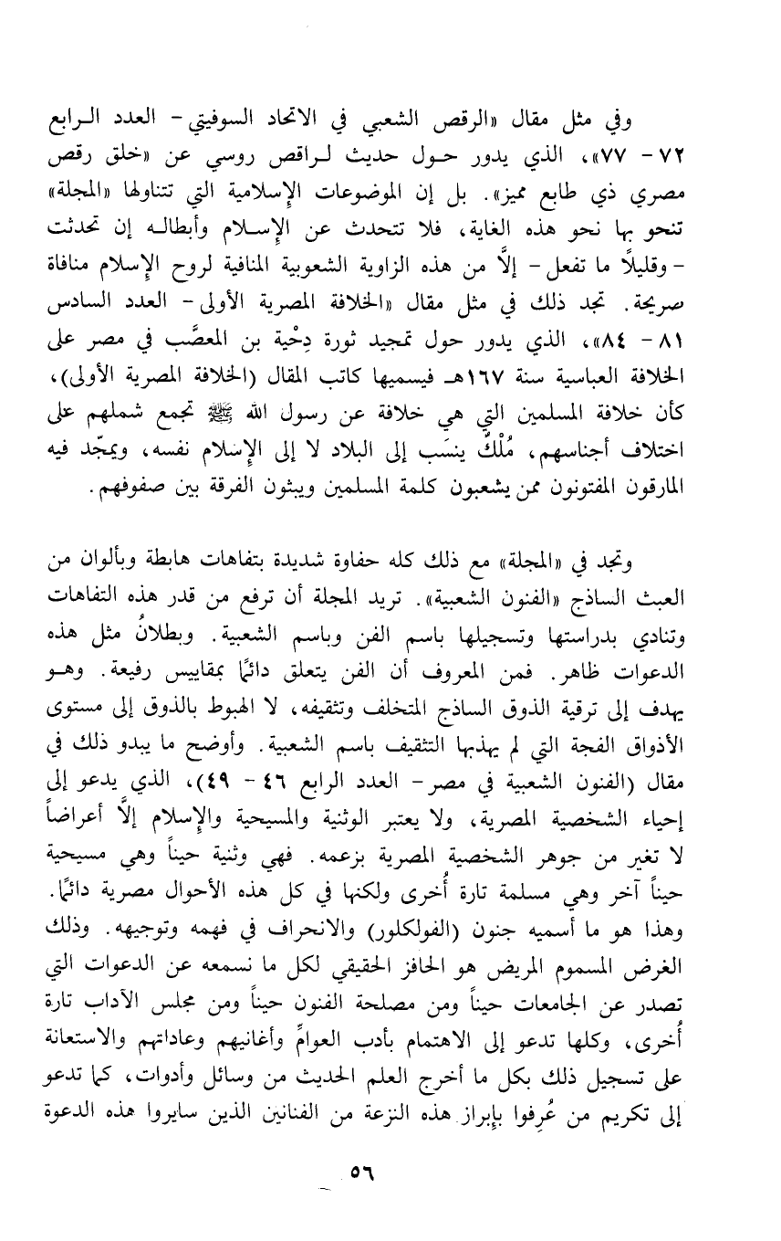 وفي مثل مقال "الرقص الشعبي في الاتحاد السوفيتي - العدد الرابع 72 - 77"، الذي يدور حول حديث لراقص روسي عن "خلق رقص مصري ذي طابع مميز". بل إن الموضوعات الِإسلامية التي تتناولها "المجلة" تنحو بها نحو هذه الغاية، فلا تتحدث عن الإِسلام وأبطاله إن تحدثت - وقليلًا ما تفعل - إلَّا من هذه الزاوية الشعوبية المنافية لروح الإِسلام منافاة صريحة. تجد ذلك في مثل مقال "الخلافة المصرية الأولى - العدد السادس 81 - 84"، الذي يدور حول تمجيد ثورة دِحْية بن المعصَّب في مصر على الخلافة العباسية سنة 167 هـ فيسميها كاتب المقال (الخلافة المصرية الأولى)، كأن خلافة المسلمين التي هي خلافة عن رسول الله - صلى الله عليه وسلم - تجمع شملهم على اختلاف أجناسهم، مُلْكٌ ينسَب إلى البلاد لا إلى الإِسلام نفسه، ويمجّد فيه المارقون المفتونون ممن يشعبون كلمة المسلمين ويبثون الفرقة بين صفوفهم.