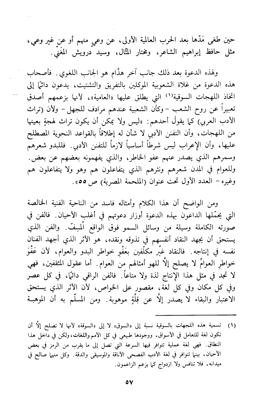 (¬1) تسمية هذه اللجهات بالسوقية نسبة إلى "السوق" لا إلى "السوقة" لأنها لا تصلح إلا أن تكون لغة للتعامل في الأسواق، ووجودها طبيعي في كل الأمم واللغات، ولكن في داخل هذا النطاق. فهي لغة عملية تتوافر فيها السرعة التي تصل إلى ما يقرب من الرمز في بعض الأحيان، بينما تتوافر في لغة الأدب الفصحى الأناقة والموسيقى والدقة. وكل منهما صالح في ميدانه، فلا تنافس ولا ازدواج كما يزعم الزاعمون.