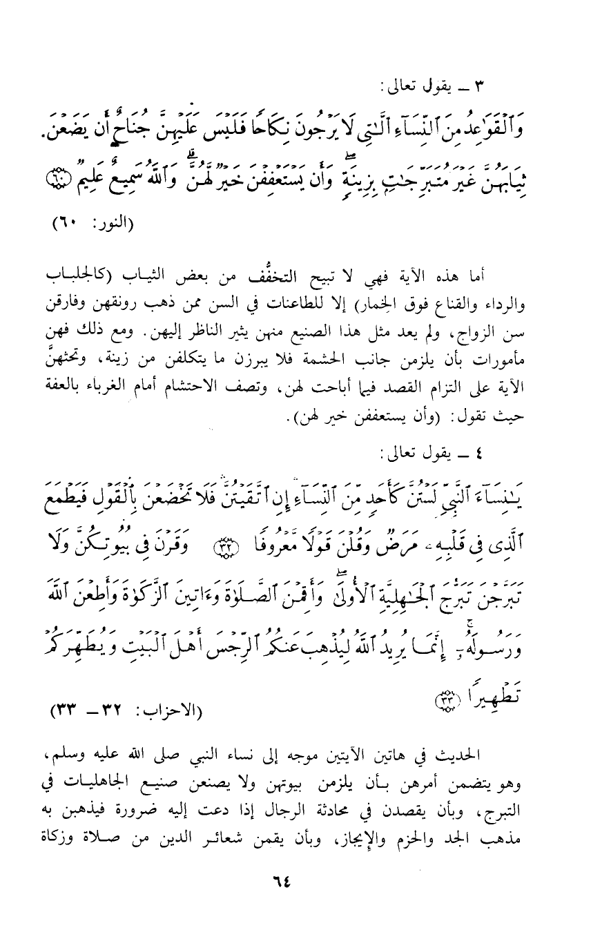 أما هذه الآية فهي لا تبيح التخفُّف من بعض الثياب (كالجلباب والرداء والقناع فوق الِخمار) إلا للطاعنات في السنن ممن ذهب رونقهن وفارقن سن الزواج، ولم يعد مثل هذا الصنيع منهن يثير الناظر إليهن. ومع ذلك فهن مأمورات بأن يلزمن جانب الحشمة فلا يبرزن ما يتكلفن من زينة، وتحثهنَّ الآية على التزام القصد فيما أباحت لهن، وتصف الاحتشام أمام الغرباء بالعفة حيث تقول: (وأن يستعففن خير لهن).