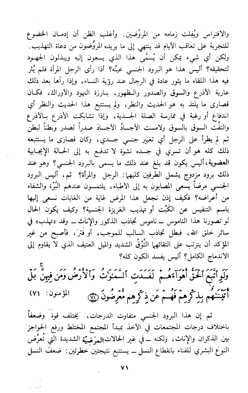 والافتراس ويُفِلت زمامه من المروِّضين. وأغلب الظن أن إدمان الخضوع للتجربة على تعاقب الأيام قد ينتهي إلى ما يريده المروِّضون من دعاة التهذيب. ولكن أي شيء يمكن أن يُسمَى هذا الذي يسعون إليه ويبذلون الجهود لتحقيقه؟ أليس هذا هو البرود الجنسي عينُه؟ أذا رأى الرجل المرأة فلم يُثر فيه هذا اللقاء ما يثور عادة في الرجال عند رؤية النساء، وإذا رآها بعد ذلك عارية الأذرع والسوق والصدور والظهور، بارزة النهود والأوراك، فكان قصارى ما يلتذ به هو الحديث والنظر، ولم يستتبع هذا الحديث والنظر أي اندفاع أو رغبة في ممارسة الصلة الجسدية، وإذا تشابكت الأذرع بالأذرع والتفَّت السوق بالسوق ولامست الأجسادُ الأجسادَ صدراً لصدر وبطناً لبطن ثم لم يطرأ على الرجل أي تغيير جنسي جسدي، وكان قصارى ما يستتبعه ذلك كله هو أن تسري في جسده نشوة لا تدفع به إلى الحالة الإِيجابية العضوية، أليس يكون قد بلغ عند ذلك ما يسمى بالبرود الجنسي؟ وهو عند ذلك برود مزدوج يشمل الطرفين كليهما: الرجل والمرأة, ثم، أليس البرود الجنسي مرضاً يسعى المصابون به إلى الأطباء، يلتمسون عندهم البُرْءَ والشفاء من أعراضه؟ فكيف إذن نجعل هذا المرض غاية من الغايات نسعى إليها باسم التنفيس عن الكَبْت أو تهذيب الغريزة الجنسية؟ وكيف يكون الحال لو تصورنا هذا الناموس - ناموس تجاذب الذكور والإِناث - وقد "تهذب" في سائر خلق الله، فبطل تجاذب السالب للموجب، أو فَترَ، فأصبح من غير المؤكد أن يترتب على التقائهما التَّوْقُ الشديد والميل العنيف الذي لا يقاوم إلى الاندماج الكامل؟ أليس يفسد الكون كله؟