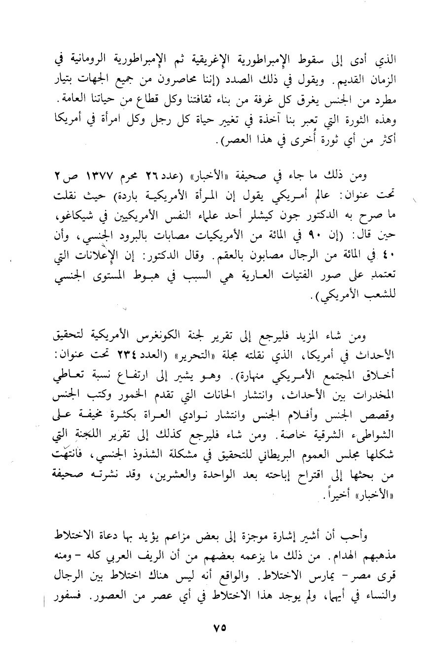 ومن شاء المزيد فليرجع إلى تقرير لجنة الكونغرس الأمريكية لتحقيق الأحداث في أمريكا، الذي نقلته مجلة "التحرير" (العدد 234 تحت عنوان: أخلاق المجتمع الأمريكي منهارة). وهو يشير إلى ارتفاع نسبة تعاطي المخدرات بين الأحداث، وانتشار الحانات التي تقدم الخمور وكتب الجنس وقصص الجنس وأفلام الجنس وانتشار نوادي العراة بكثرة مخيفة على الشواطىء الشرقية خاصة. ومن شاء فليرجع كذلك إلى تقرير اللجنة التي شكلها مجلس العموم البريطاني للتحقيق في مشكلة الشذوذ الجنسي، فانتهت من بحثها إلى اقتراح إباحته بعد الواحدة والعشرين، وقد نشرته صحيفة "الأخبار" أخيراً.