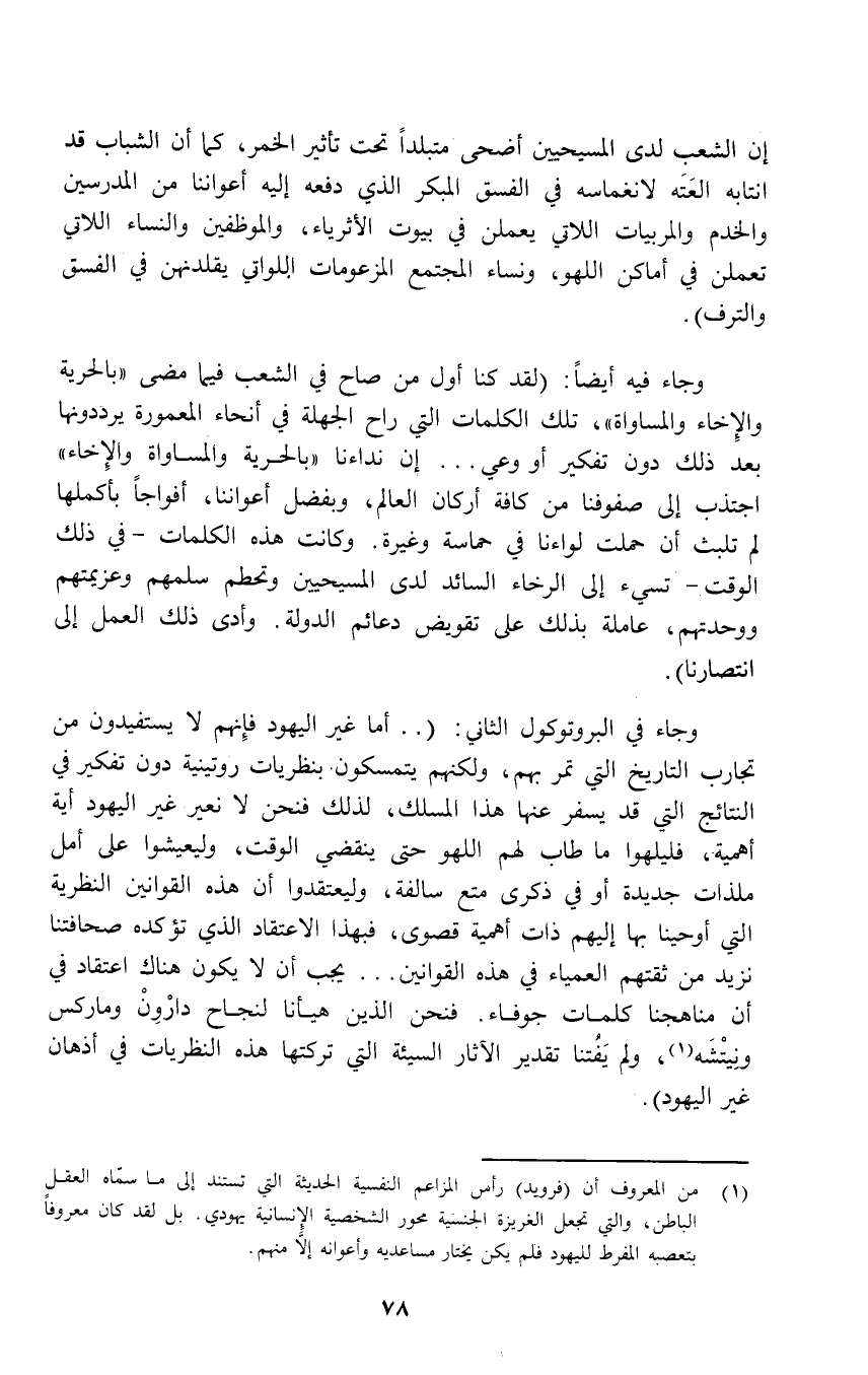 (¬1) من المعروف أن (فرويد) رأس المزاعم النفسية الحديثة التي تستند إلى ما سمّاه العقلِ الباطن، والتي تجعل الغريزة الجنسية محور الشخصية الإنسانية يهودي. بل لقد كان معروفاً بتعصبه المفرط لليهود فلم يكن يختار مساعديه وأعوانه إلَّا منهم.