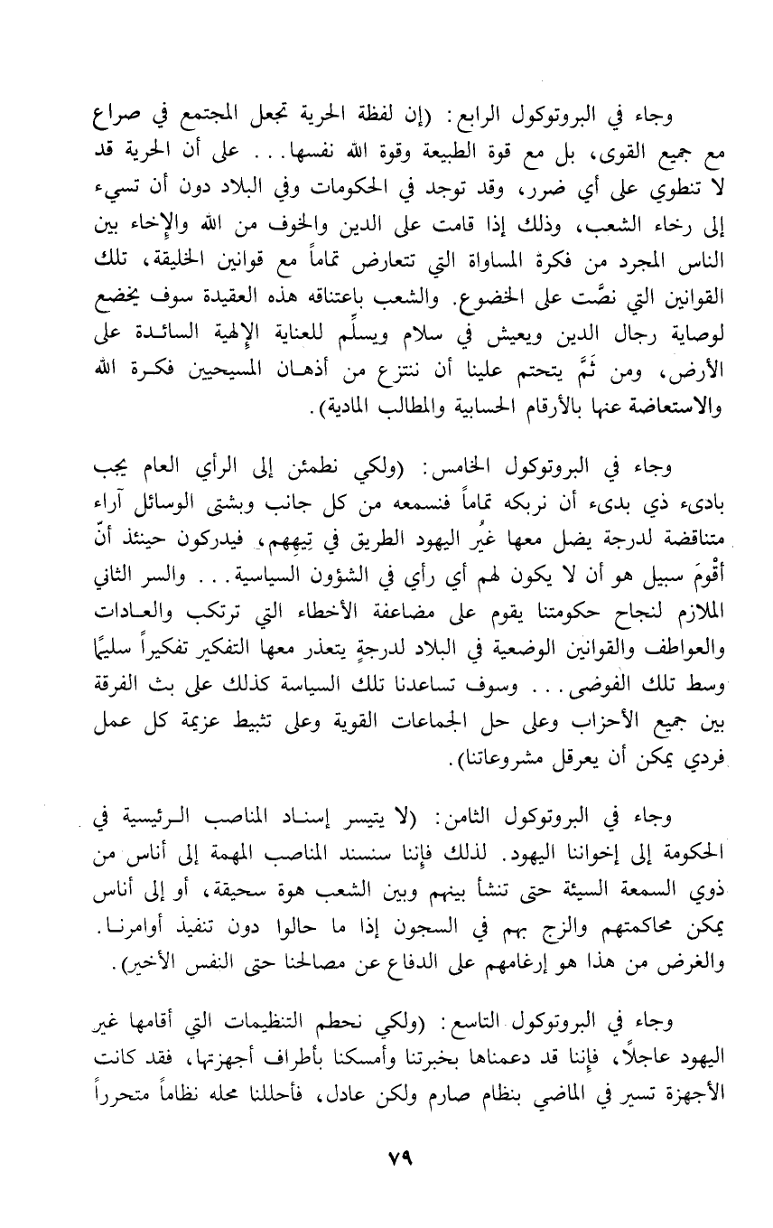 وجاء في البروتوكول التاسع: (ولكي نحطم التنظيمات التي أقامها غير اليهود عاجلاً، فإِننا قد دعمناها بخبرتنا وأمسكنا بأطراف أجهزتها، فقد كانت الأجهزة تسير في الماضي بنظام صارم ولكن عادل، فأحللنا محله نظاماً متحرراً