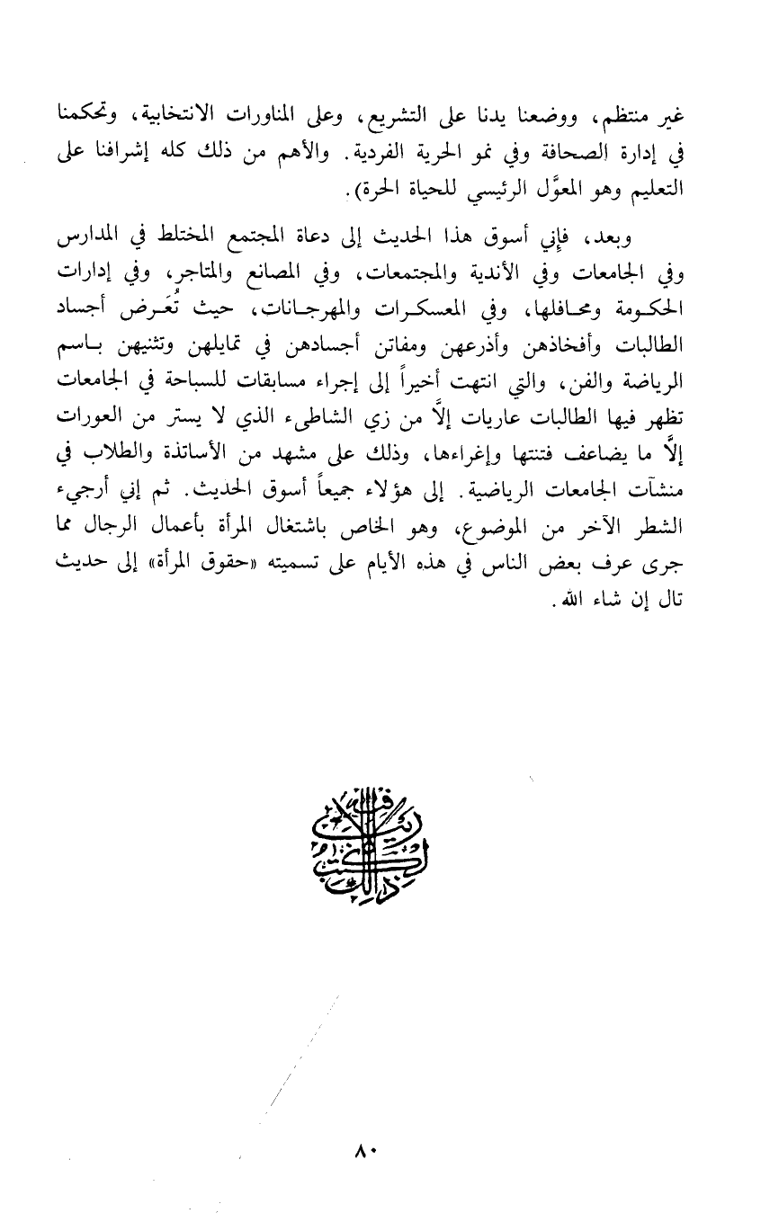 وبعد، فإِني أسوق هذا الحديث إلى دعاة المجتمع المختلط في المدارس وفي الجامعات وفي الأندية والمجتمعات، وفي المصانع والمتاجر، وفي إدارات الحكومة ومحافلها، وفي المعسكرات والمهرجانات، حيث تُعَرض أجساد الطالبات وأفخاذهن وأذرعهن ومفاتن أجسادهن في تمايلهن وتثنيهن باسم الرياضة والفن، والتي انتهت أخيراً إلى إجراء مسابقات للسباحة في الجامعات تظهر فيها الطالبات عاريات إلَّا من زي الشاطئ الذي لا يستر من العورات إلَّا ما يضاعف فتنتها وإغراءها، وذلك على مشهد من الأساتذة والطلاب في منشآت الجامعات الرياضية. إلى هؤلاء جميعاً أسوق الحديث. ثم إني أرجيء الشطر الآخر من الموضوع، وهو الخاص باشتغال المرأة بأعمال الرجال مما جرى عرف بعض الناس في هذه الأيام على تسميته "حقوق المرأة" إلى حديث تال إن شاء الله.