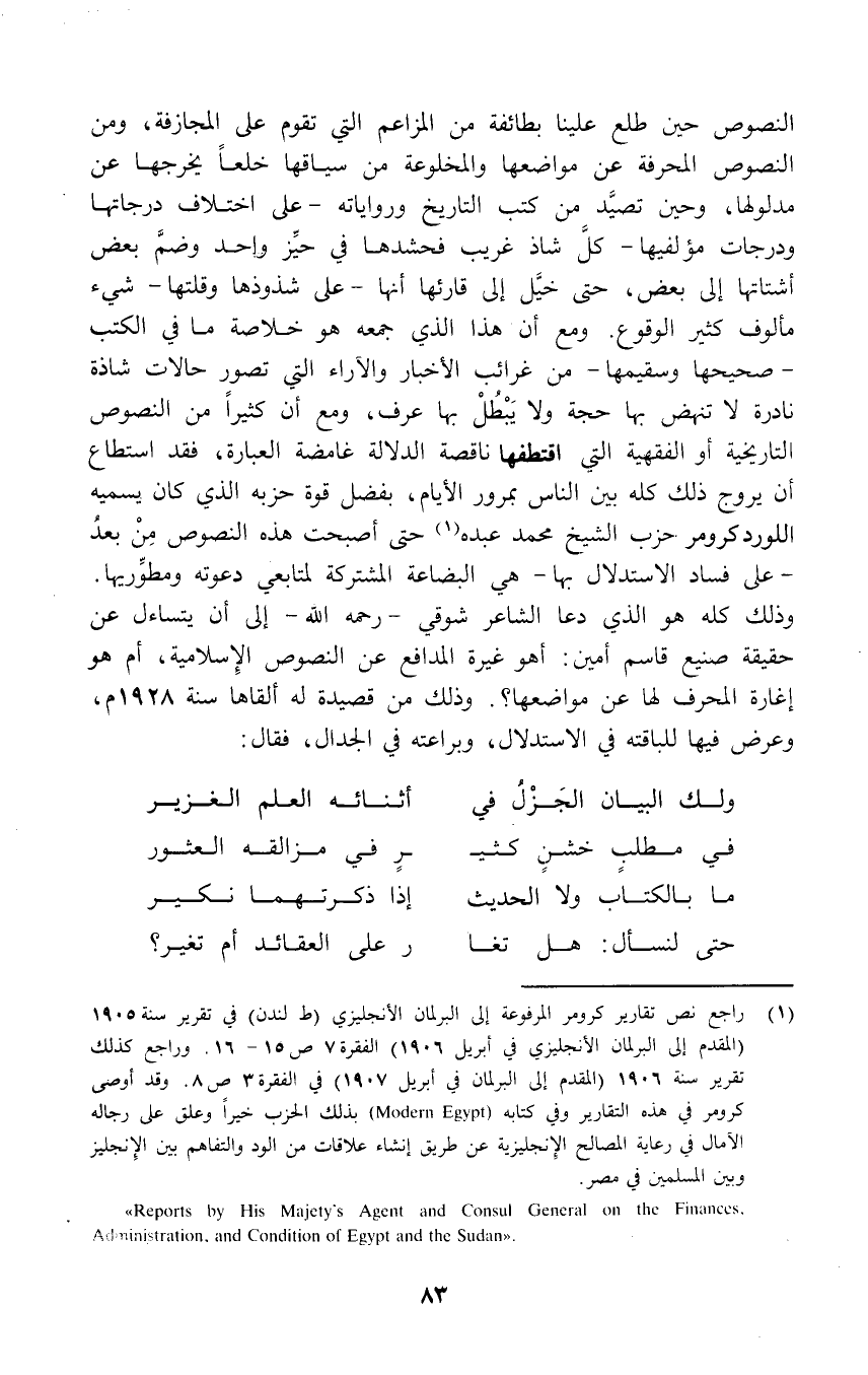 النصوص حين طلع علينا بطائفة من المزاعم التي تقوم على المجازفة، ومن النصوص الحرفة عن مواضعها والمخلوعة من سياقها خلعاً يخرجها عن مدلولها، وحين تصيَّد من كتب التاريخ ورواياته - على اختلاف درجاتها ودرجات مؤلفيها - كلَّ شاذ غريب فحشدها في حيِّز واحد وضمَّ بعض أشتاتها إلى بعض، حتى خيَّل إلى قارئها أنها - على شذوذها وقلتها - شيء مألوف كثير الوقوع. ومع أن هذا الذي جمعه هو خلاصة ما في الكتب - صحيحها وسقيمها - من غرائب الأخبار والآراء التىِ تصور حالات شاذة نادرة لا تنهض بها حجة ولا يَبْطُلْ بها عرف، ومع أن كثيراً من النصوص التاريخية أو الفقهية التي اقتطفها ناقصة الدلالة غامضة العبارة، فقد استطاع أن يروج ذلك كله بين الناس بمرور الأيام، بفضل قوة حزبه الذي كان يسميه اللورد كرومر. حزب الشيِخ مُحَمَّدْ عبده (¬1) حتى أصبحت هذه النصوص مِنْ بعدُ - على فساد الاستدلال بها - هي البضاعة المشتركة لمتابعي دعوته ومطوِّريها. وذلك كله هو الذي دعا الشاعر شوقي - رحمه الله - إلى أن يتساءل عن حقيقة صنيع قاسم أمين: أهو غيرة المدافع عن النصوص الإِسلامية، أم هو إغارة المحرف لها عن مواضعها؟. وذلك من قصيدة له ألقاها سنة 1928 م، وعرض فيها للباقته في الاستدلال، وبراعته في الجدال، فقال: