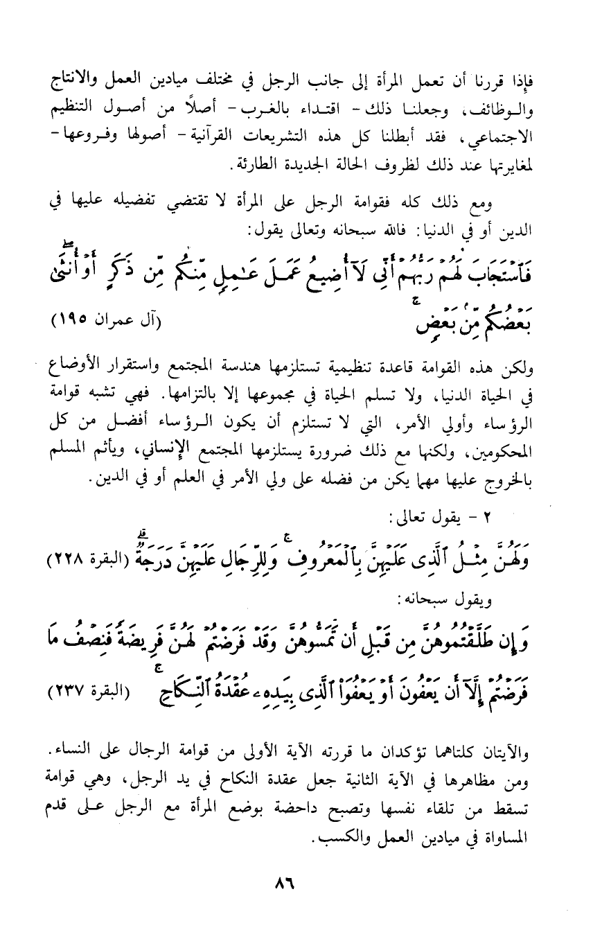 والآيتان كلتاهما تؤكدان ما قررته الآية الأولى من قوامة الرجال على النساء. ومن مظاهرها في الآية الثانية جعل عقدة النكاح في يد الرجل، وهي قوامة تسقط من تلقاء نفسها وتصبح داحضة بوضع المرأة مع الرجل على قدم المساواة في ميادين العمل والكسب.