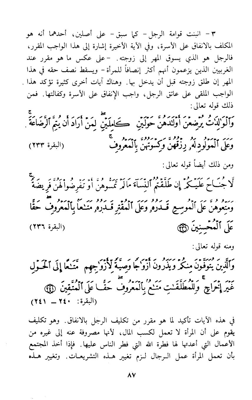 3 - انبنت قوامة الرجل - كما سبق - على أصلين، أحدهما أنه هو المكلف بالانفاق على الأسرة، وفي الآية الأخيرة إشارة إلى هذا الواجب المقرر، فالرجل هو الذي يسوق المهر إلى زوجته.- على عكس ما هو مقرر عند الغربيين الذين يزعمون أنهم أكثر إنصافاً للمرأة - ويسقط نصف حقه في هذا المهر إن طلق زوجته قبل أن يدخل بها. وهناك آيات أخرى كثيرة تؤكد هذا الواجب الملقن على عاتق الرجل، واجب الإِنفاق على الأسرة وكفالتها. فمن ذلك قوله تعالى: